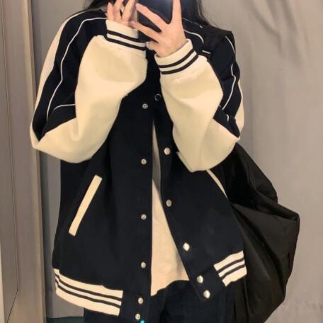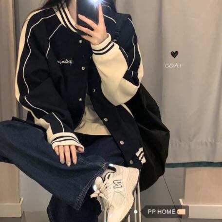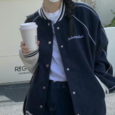 あえて、かっこよさと可愛らしさを兼ね備えたそのデザインは、一目見ただけでは虜になること間違いなし。ネイビーカラーのボディには、野球ユニフォーム風の赤と白のステッチラインが全体を引き立て、メンズライクな雰囲気を醸し出しています。前開きのデザインなので、脱ぎ着も楽ちん。ポケットも付いてるのでお出かけにもぴったり!また、ゆったりとしたシルエットで重ね着もしやすく、スタイルやシーンを選ばず使えるのが魅力です。学生や、20代の女性にもおススメ!秋にぴったりのジャケットを手に入れて、いろいろな場所でおしゃれに活躍してください。