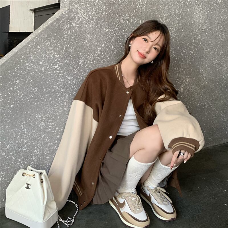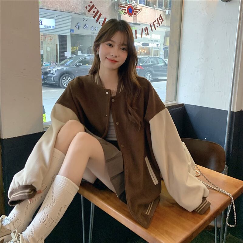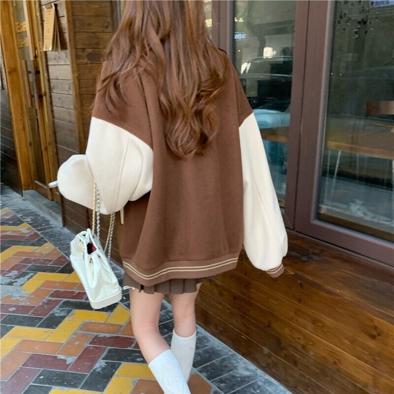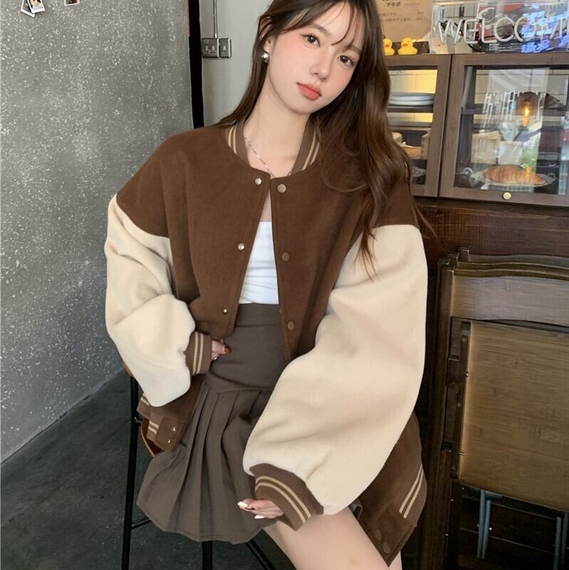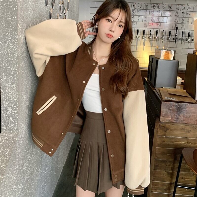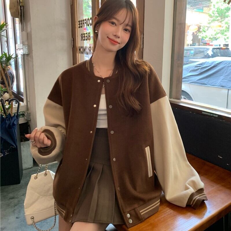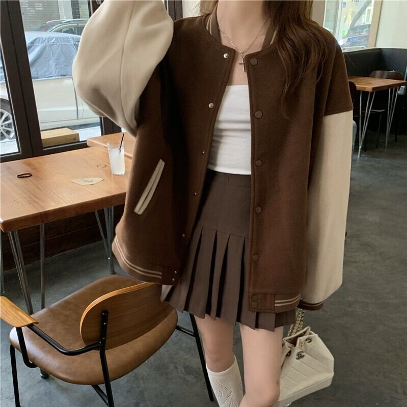 ジャケット アウター シャンパー 上着 茶色 ブラウン ミディアム丈 長袖 ストレート ポケット ボタン かわいい 大人可愛い シンプル カジュアル おしゃれ かっこいい レトロ こなれ感 ラフ ガーリー ルーズ 個性的 主役級 存在感 抜け感 アメリカンスタイル 野球ユニフォーム風 無地 ライン 春 秋 10代 20代 レディース 通勤 学生 通学 デート お出かけ 公園デビュー 女子会 休日 イベント 旅行 着回し 普段使い ファッション コーデ 定番 トレンド サイズ S M L ゆったり
