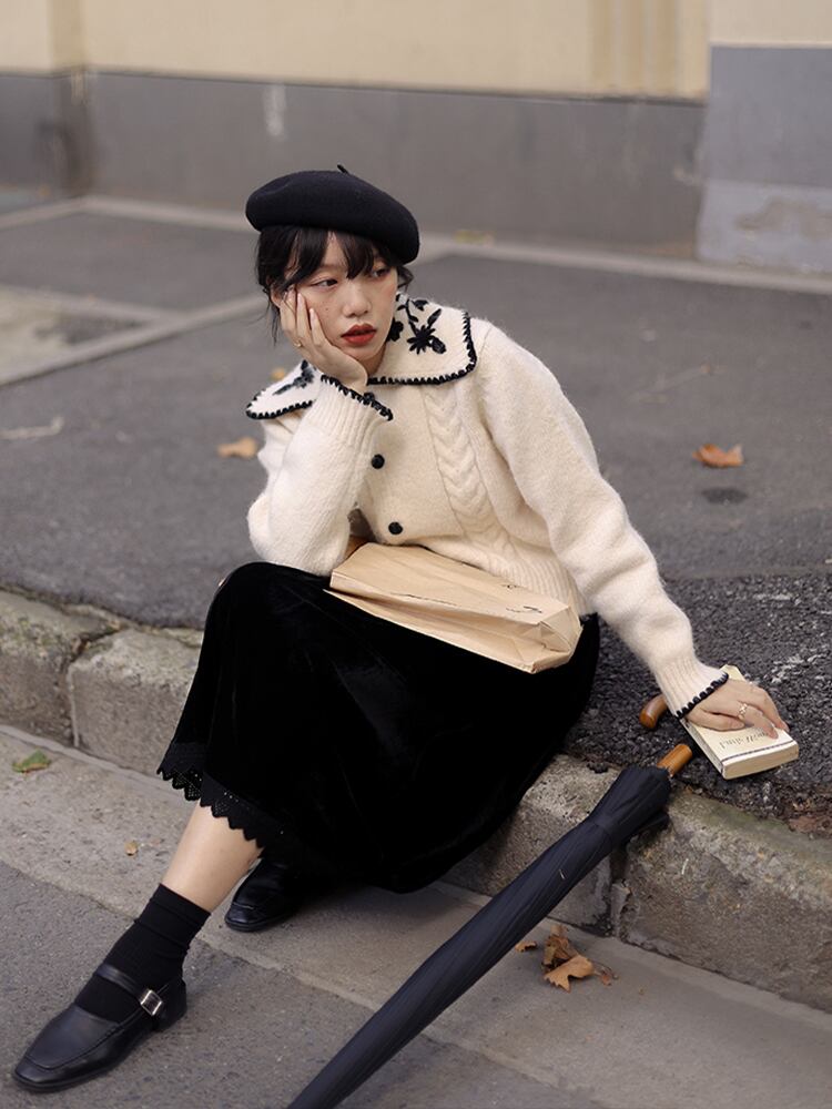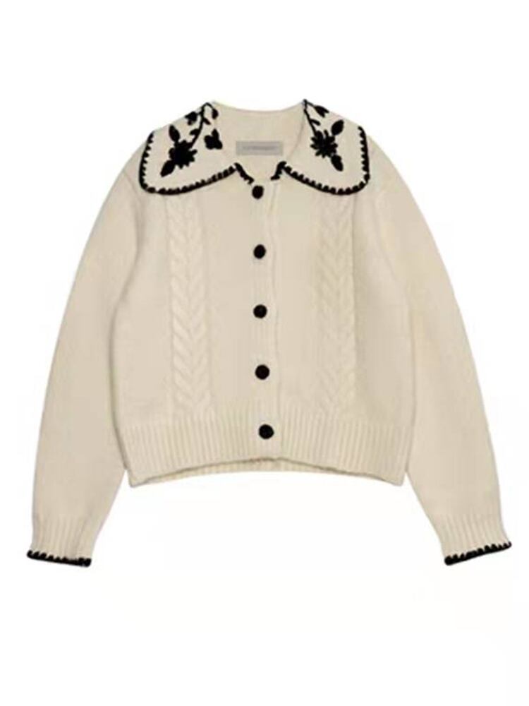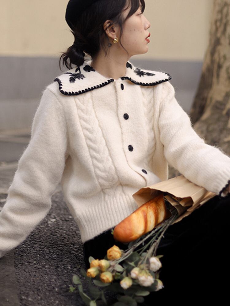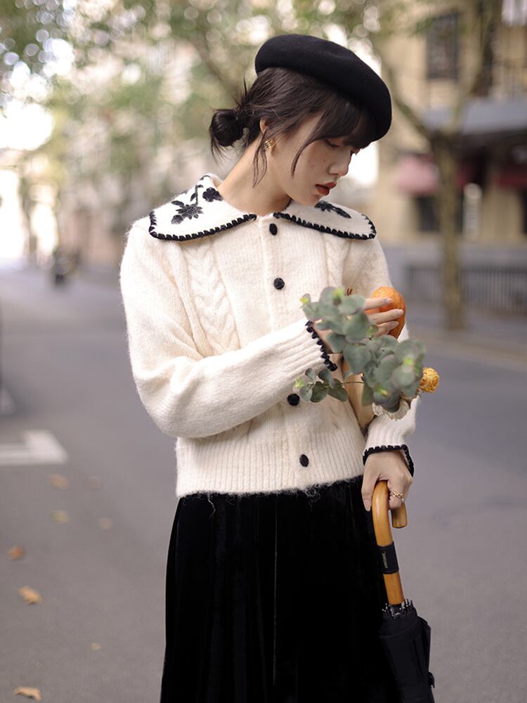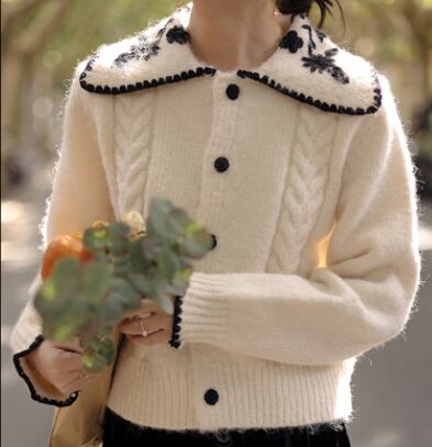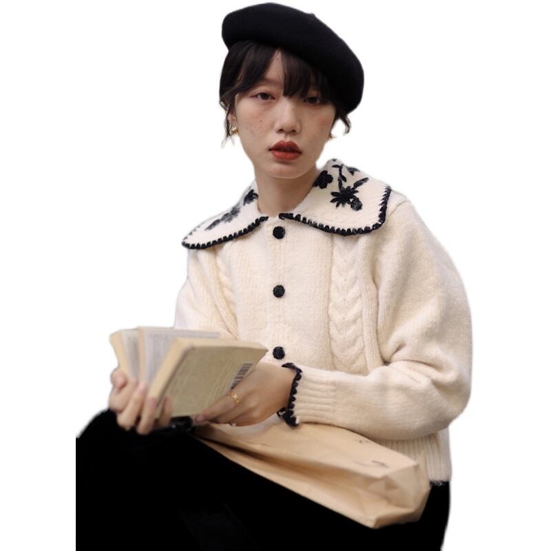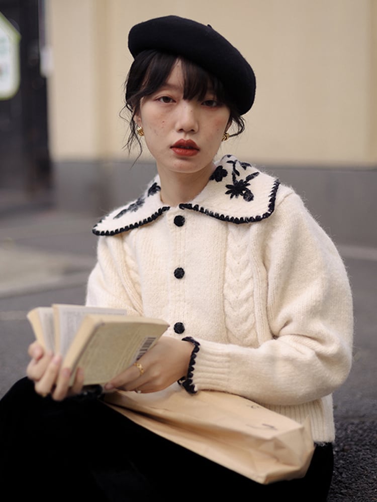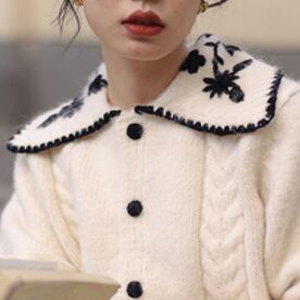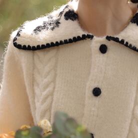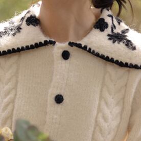 ショート丈カーディガン トップス ニット セーター スイート ガーリー ベージュ ショート丈 袖あり 長袖 襟付き ストレート シングルブレスト ボタン 大人女子 大人 上品 おしゃれ デイリーウェア レトロ レトロ風 こなれ感 キュート かわいい 女子 個性的 デザイン 主役級 存在感 柄 花柄 フラワー 春 スプリング 秋 オータム 20代 10代 30代 レディース 女性用 学生 学校 通学 デート お出かけ 女子会 食事会 着回し 普段使い S M L XL