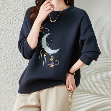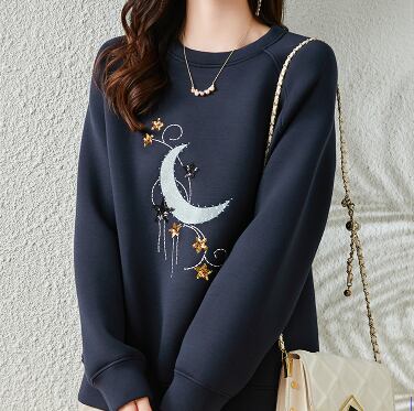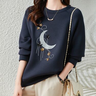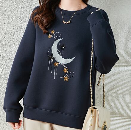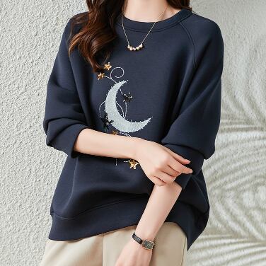 ムーンアップリケ スパンコールスター柄 刺繍 ステッチ ラグランスリーブ トップス プルオーバー トレーナー スウェット ミディアム丈 長袖 ラウンドネック 綿 ポリエステル かわいい 大人可愛い シンプル カジュアル 上品 おしゃれ 大人女子 柄 春 秋 レディース 女性用 ママ 女の子 学生 通学 デート お出かけ 公園デビュー 休日 普段使い 韓国系 オルチャン ファッション コーデ スタイル 着回し 重ね着 星柄 月柄 M L XL 2XL 3XL 4XL 大きいサイズ ゆったり ネイビー
