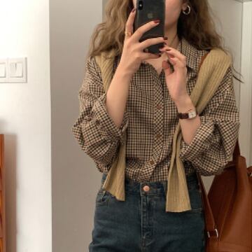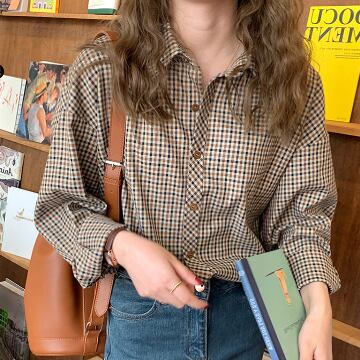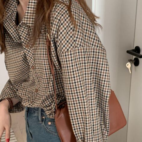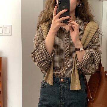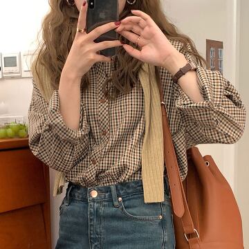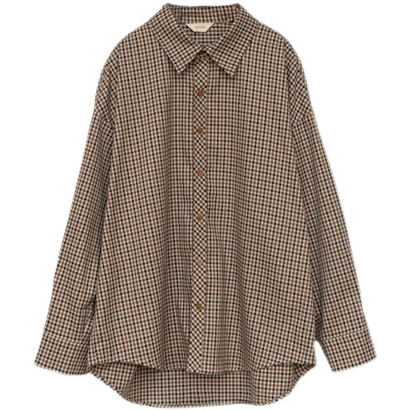 チェック柄シャツ トップス シャツ ブラウス カジュアル ブラウン 茶色 レギュラー丈 袖あり 長袖 襟付き 綿 コットン ポリエステル 大人女子 大人 上品 おしゃれ デイリーウェア レトロ レトロ風 こなれ感 キュート かわいい 女子 個性的 デザイン 主役級 存在感 柄 チェック柄 春 スプリング 秋 オータム 20代 10代 30代 レディース 女性用 学生 学校 通学 デート お出かけ 女子会 食事会 着回し 普段使い ファッション コーデ S M L XL