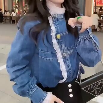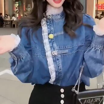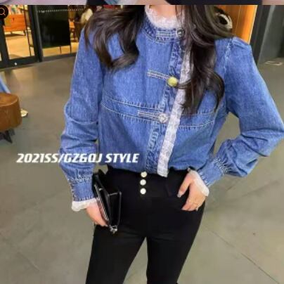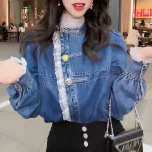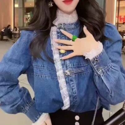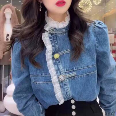 デニムシャツ トップス シャツ ブラウス クラシック カジュアル ブルー 青 レギュラー丈 袖あり 長袖 スタンドカラー ストレート ボタン レース ポリエステル 大人女子 大人 上品 おしゃれ エレガント デイリーウェア レトロ レトロ風 こなれ感 個性的 デザイン 主役級 存在感 無地 春 スプリング 秋 オータム 20代 10代 30代 レディース 女性用 学生 学校 通学 デート お出かけ 女子会 食事会 ファッション コーデ S M L XL