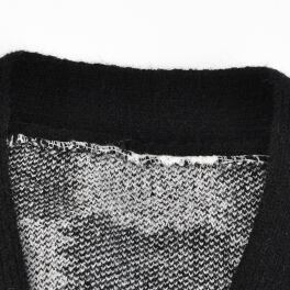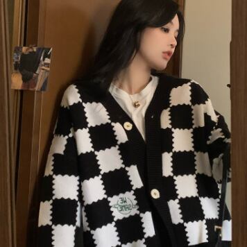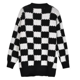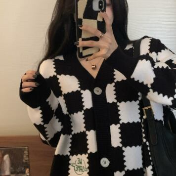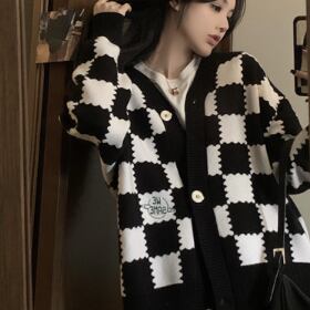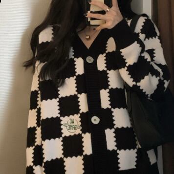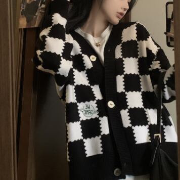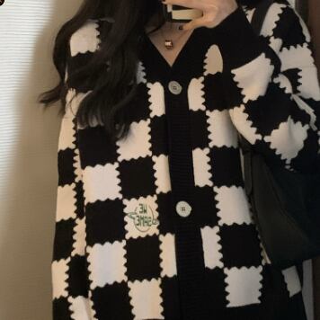 チェッカーボード柄のセーターカーディガン。