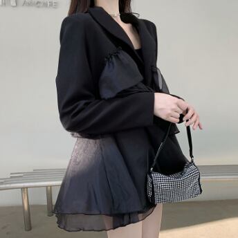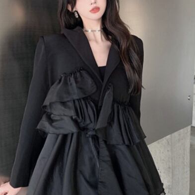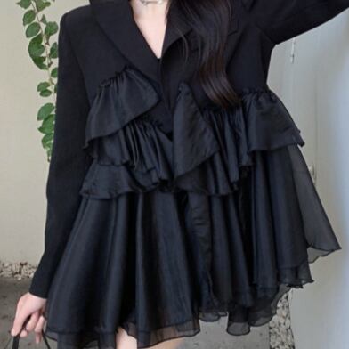 「エレガントさとかわいさをMIXした、ブラックフリルミニ丈ワンピース」。Aラインのシルエットに、Vネックと長めの袖で品のある印象を残せる一着です。異素材をMIXしたデザインが特徴的で、シフォン素材のフリルが女性らしさをアップしてくれます。