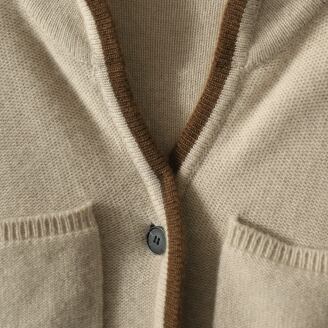 シンプルかつおしゃれなデザインが魅力的な配色トリミングの羽織りものが入荷しました。ミディアム丈で袖あり、女性らしいシルエットになっています。前開きの4ポケット仕様で使い勝手も◎。Vネックのショールカラーが大人っぽく、カジュアルからきれいめまで、様々なシチュエーションで活躍してくれます。伸縮性のあるニット素材で着心地も快適です。キャメルブラウンとベージュの2色展開で、春から冬まで長く愛用できます。