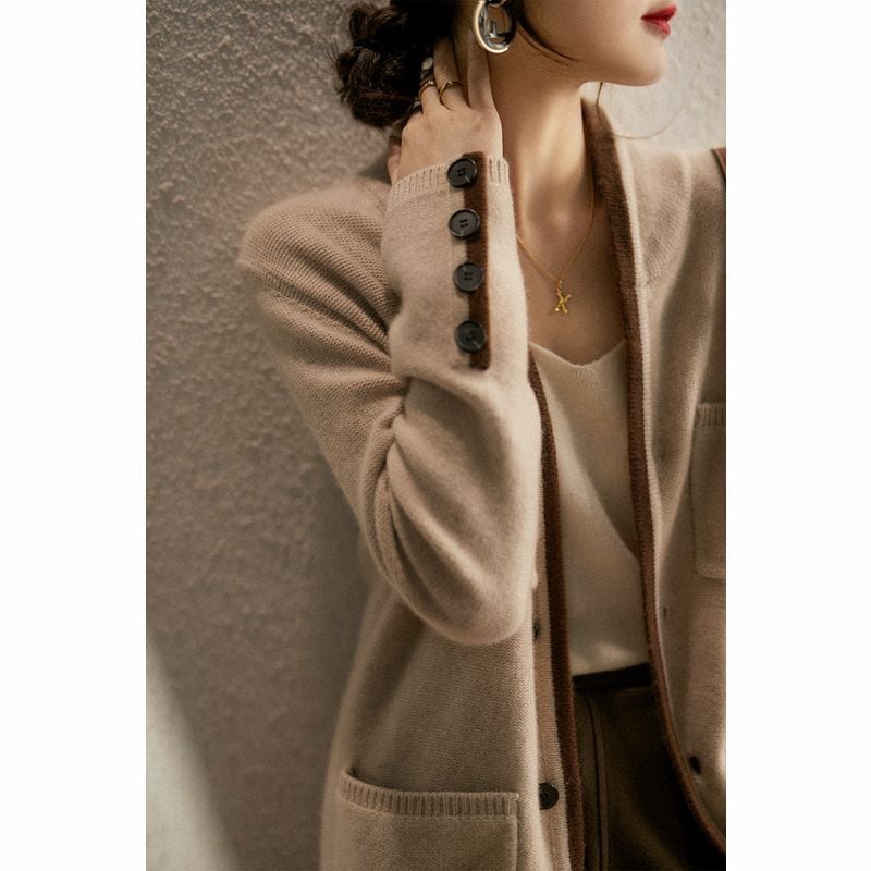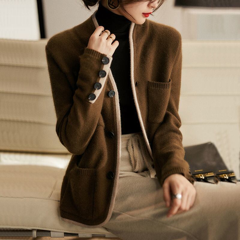 配色トリミング 4ポケット ショールカラー 羽織りもの トップス アウター カーディガン ジャケット 上着 ミディアム丈 袖あり 長袖 Vネック ポケット 前開き 伸縮性 ニット かわいい 大人可愛い きれいめ シンプル カジュアル 上品 おしゃれ お洒落 大人女子 無地 春 秋 冬 レディース 女性用 ママ 女の子 OL 通勤 学生 通学 デート お出かけ 女子会 休日 着回し 普段使い 重ね着 韓国系 オルチャン ファッション コーデ スタイル S M L XL キャメルブラウン ベージュ