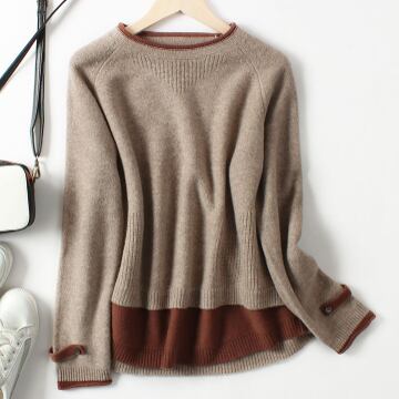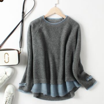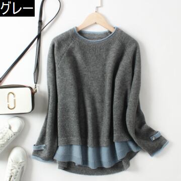 フェイクレイヤードセーター トップス プルオーバー シンプル グレー 灰色 キャメル ミディアム丈 袖あり 長袖 ラウンドネック ストレート 大人女子 大人 上品 おしゃれ きれいめ シンプル デイリーウェア レトロ レトロ風 こなれ感 ルーズ シルエット ラフ 個性的 デザイン 主役級 存在感 柄 配色 秋 オータム 20代 30代 40代 レディース 女性用 オフィス ビジネス OL 通勤 着回し 普段使い S M L XL 2XL くすみカラー