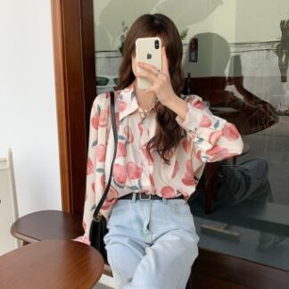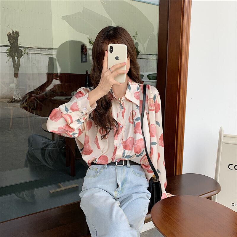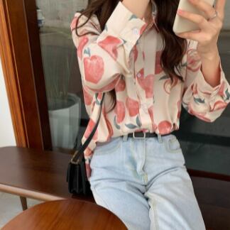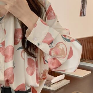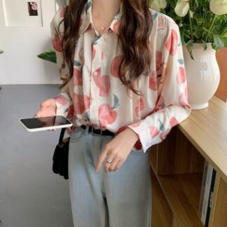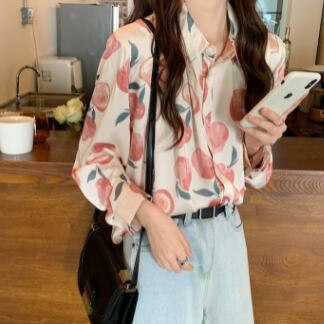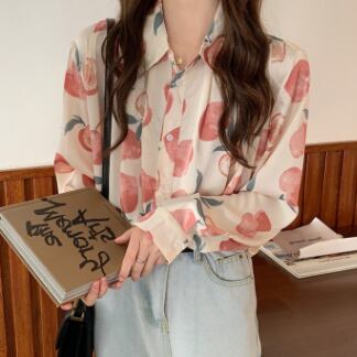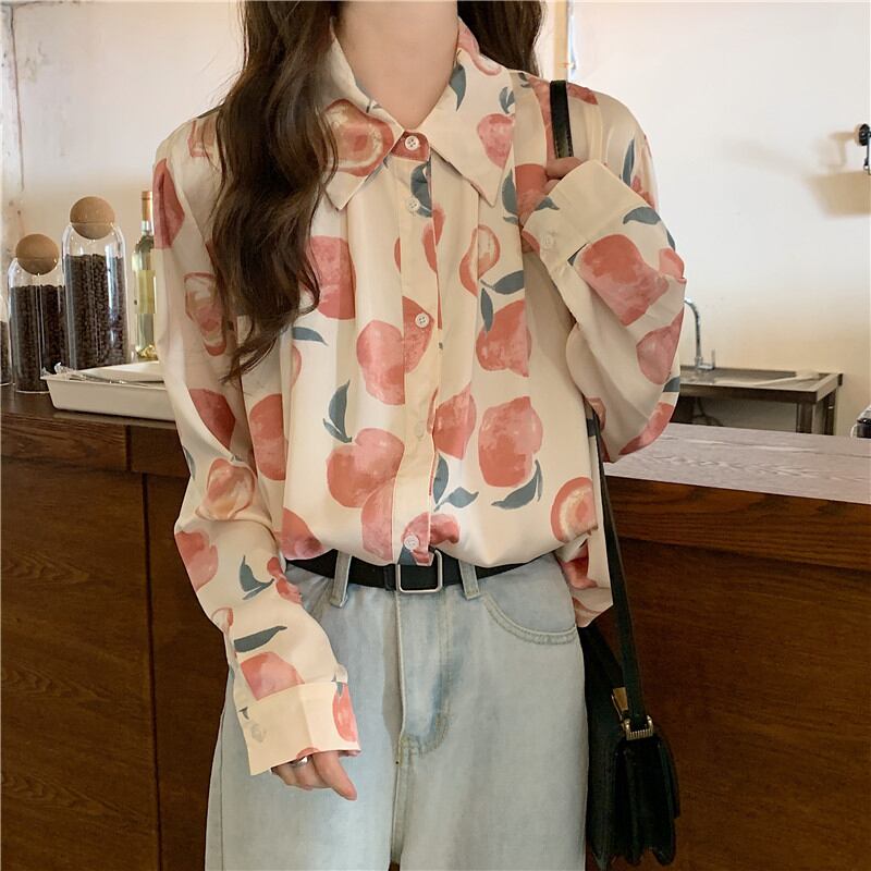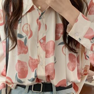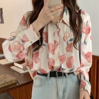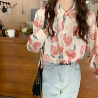 ピーチ柄シフォンシャツ トップス シャツ ブラウス カジュアル レギュラー丈 袖あり 長袖 襟付き ストレート シングルブレスト ボタン ポリエステル 大人女子 大人 上品 おしゃれ デイリーウェア レトロ レトロ風 こなれ感 ルーズ シルエット ラフ キュート かわいい 女子 個性的 デザイン 主役級 存在感 柄 春 スプリング 夏 サマー 20代 10代 レディース 女性用 学生 学校 通学 着回し 普段使い ファッション コーデ S M L XL 2XL