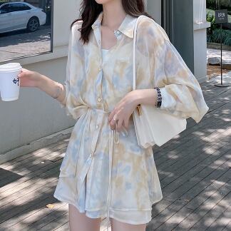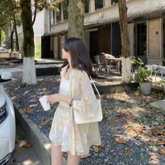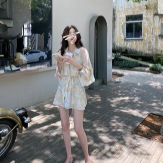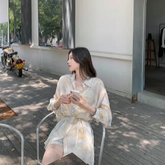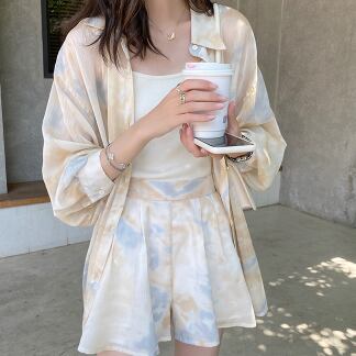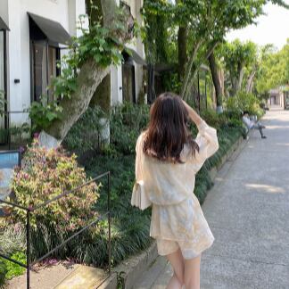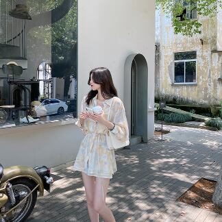 シフォンシャツセットアップで、フェミニンでありながらどこかレトロな雰囲気を漂わせるデザインです。トップスには、襟付きのシングルブレスト、フロントにはスタイリッシュなボタンデザインが施されています。パンツもミディアム丈で、ルーズなシルエットで着やすく、キュートでかわいらしい雰囲気を演出します。ペールトーンの淡色柄で、夏らしい爽やかな印象を与えます。