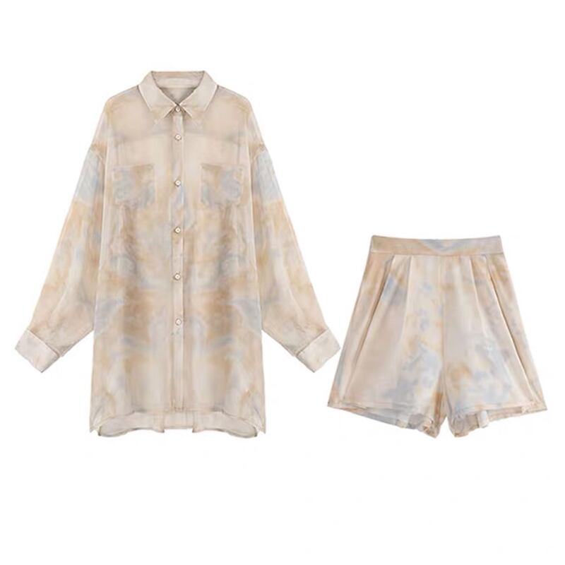 シフォンシャツ セットアップ トップス パンツ ボトムス フェミニン ミディアム丈 袖あり 長袖 襟付き シングルブレスト ボタン 上下セット ツーピース 大人女子 大人 上品 おしゃれ デイリーウェア レトロ レトロ風 こなれ感 ルーズ シルエット ラフ キュート かわいい 女子 個性的 デザイン 主役級 存在感 柄 夏 サマー 20代 10代 レディース 女性用 学生 学校 通学 デート お出かけ 女子会 食事会 着回し 普段使い M S ペールトーン 淡色