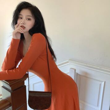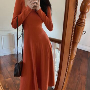 タイト&フレアスカートの長袖ミモレ丈ワンピースです。
