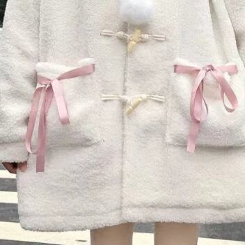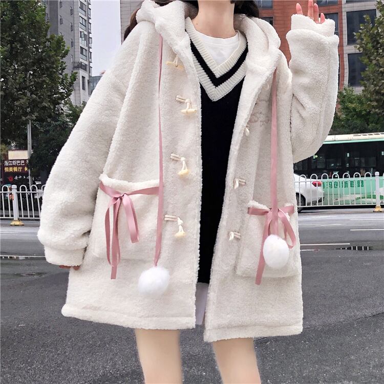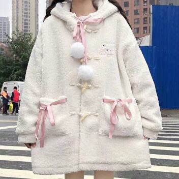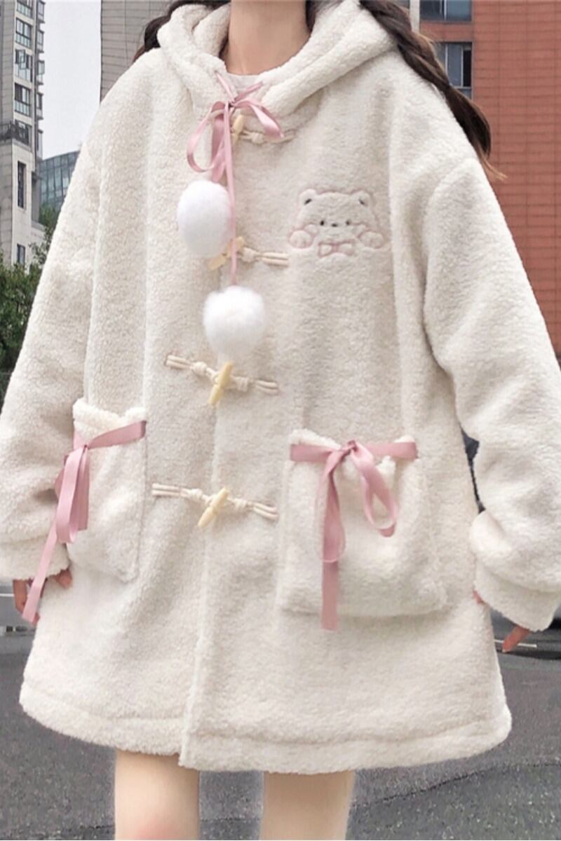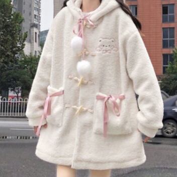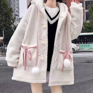 くまみみコート アウター コート スイート ガーリー ラブリー ホワイト 白 ミディアム丈 袖あり 長袖 フード ボタン ポケット モコモコ デイリーウェア レトロ レトロ風 こなれ感 ルーズ シルエット ラフ キュート かわいい 女子 個性的 デザイン 主役級 存在感 柄 アニマル柄 秋 オータム 冬 ウインター 20代 10代 レディース 女性用 キッズ 女の子 学生 学校 通学 着回し 普段使い ファッション コーデ 暖かい 防寒 ワンサイズ パステルカラー