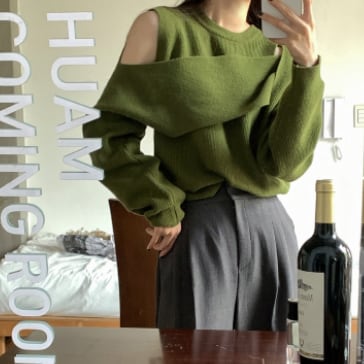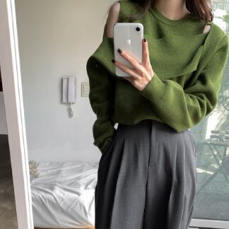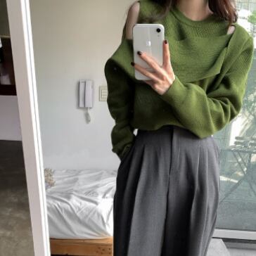 アシンメトリーニット トップス セーター モダン グレー 灰色 グリーン 緑 レッド 赤 レギュラー丈 袖あり 長袖 オフショルダー ウール 大人女子 大人 上品 おしゃれ かっこいい クール エレガント デイリーウェア レトロ レトロ風 こなれ感 個性的 デザイン 主役級 存在感 無地 春 スプリング 20代 30代 レディース 女性用 学生 学校 通学 デート お出かけ 女子会 食事会 着回し 普段使い トレンド ファッション コーデ ワンサイズ くすみカラー