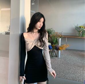 ミニドレス ミニワンピース ワンピース ミニ ミニ丈 ショート ショート丈 膝上 長袖 オフショルダー オフショル スリム タイト 細身 Iライン バイカラー かわいい 大人可愛い 大人 おしゃれ お洒落 大人可愛い 大人女子 キュート ガーリー 個性的 セクシー 主役級 存在感 無地 春 夏 結婚式 二次会 披露宴 10代 20代 30代 レディース 女性用 女の子 デート お出かけ パーティー イベント ホテル レストラン 韓国 韓国系 オルチャン ファッション コーデ スタイル モテトレンド