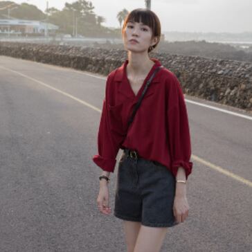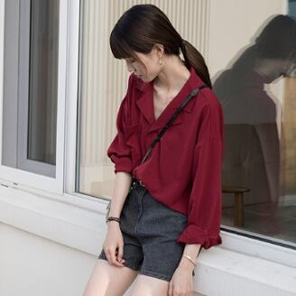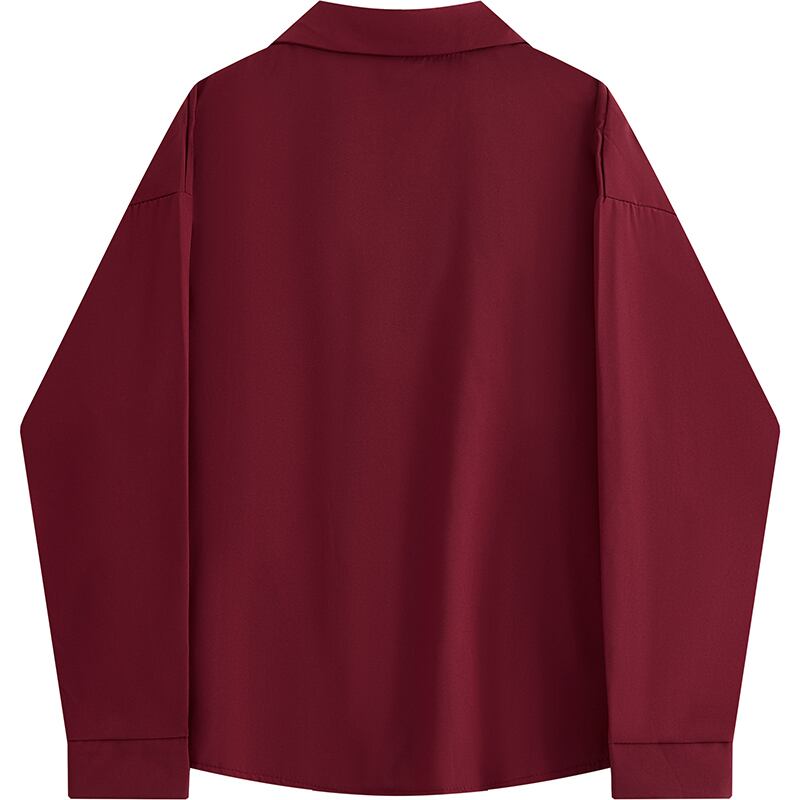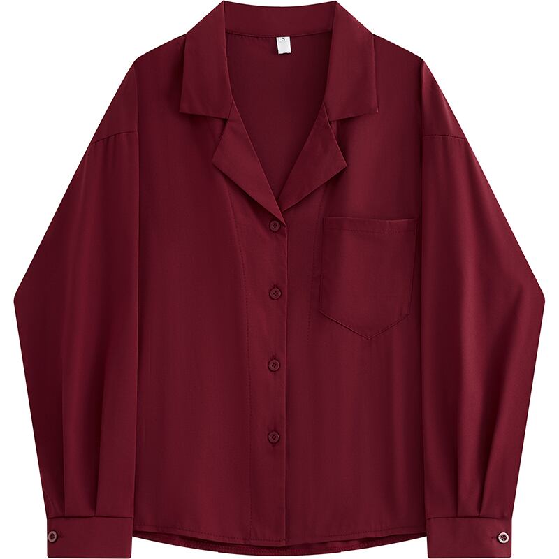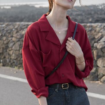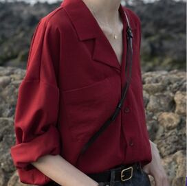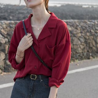 長袖シャツ トップス カラーシャツ 赤 レッド ワインレッド ミディアム丈 長袖 シャツ袖 Vネック ストレート ポケット 前開き ボタン きれいめ シンプル カジュアル 大人 おしゃれ かっこいい レトロ 大人可愛い 大人女子 こなれ感 ラフ 個性的 クール 存在感 とろみ感 抜け感 無地 春 秋 謝恩会 10代 20代 30代 通勤 通学 デート お出かけ 女子会 休日 ホテル ガーデン レストラン 着回し 普段使い 重ね着 ファッション コーデ スタイル 定番 サイズ S M L 大人カラー