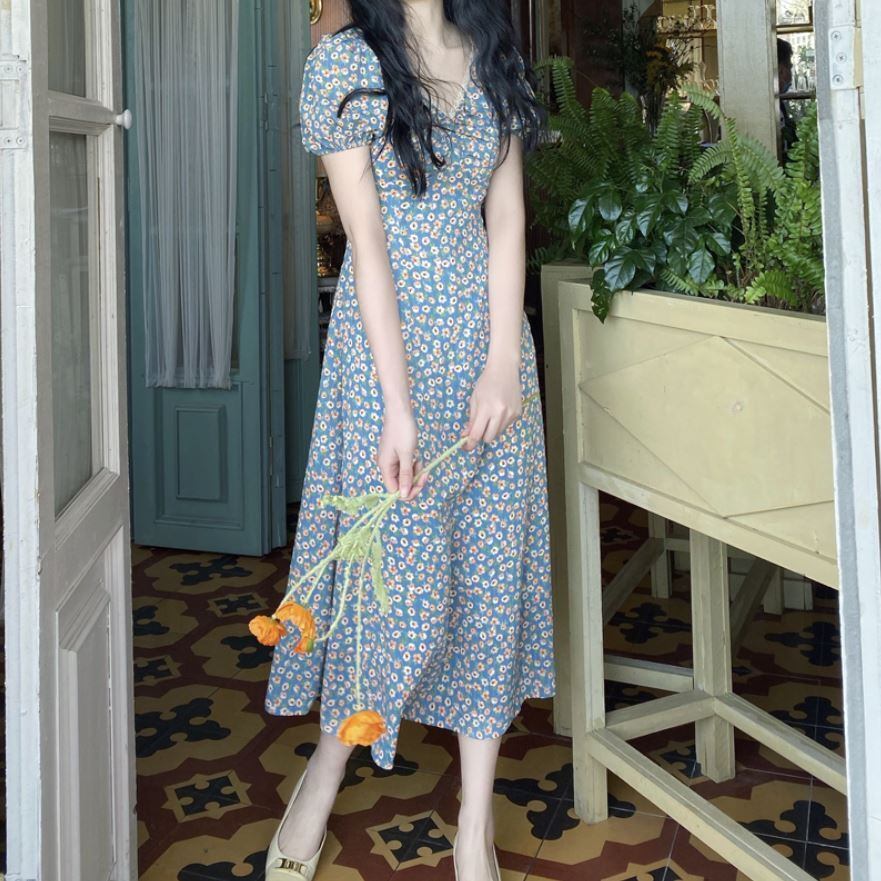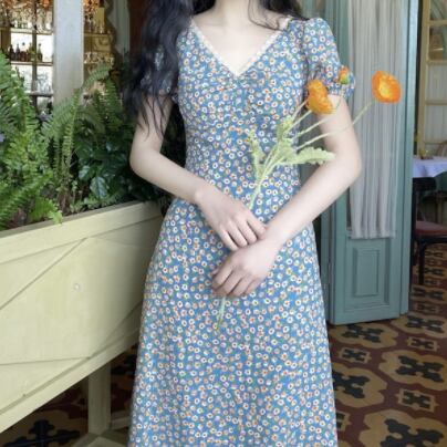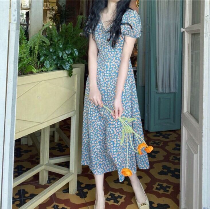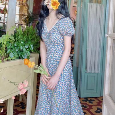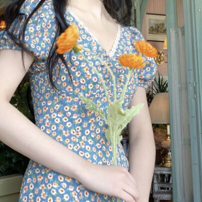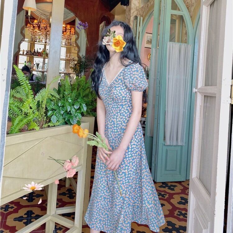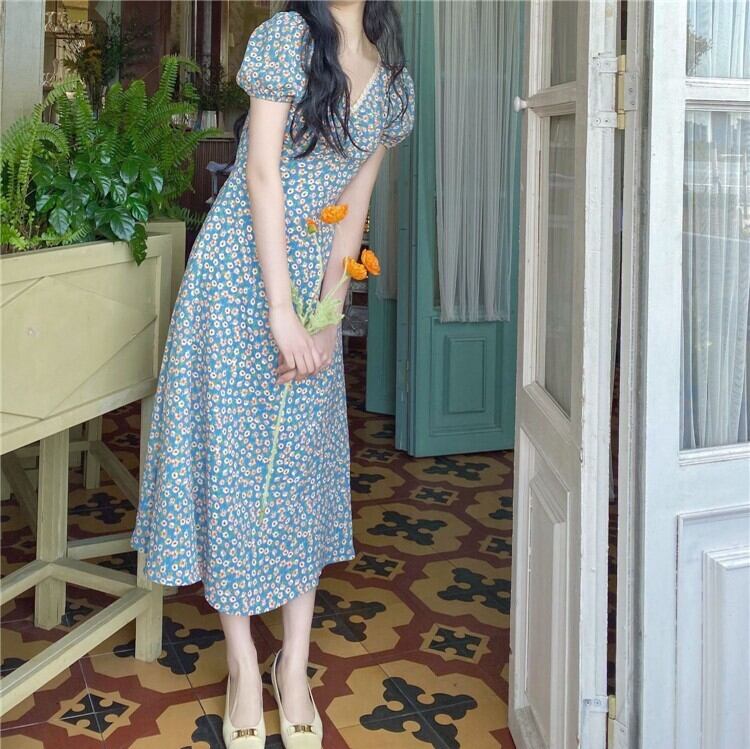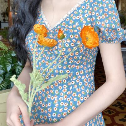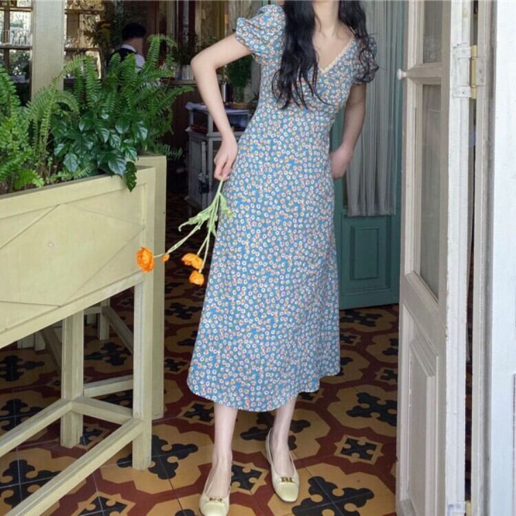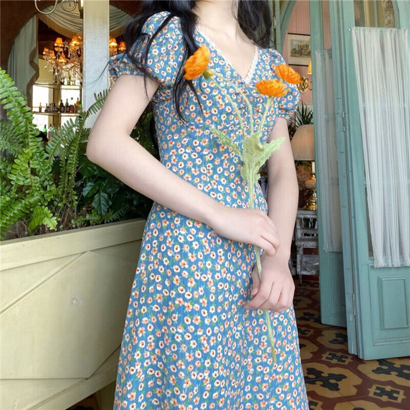 胸元ギャザー フラワープリント フローラル ネックレーストリミング ふんわり袖 ワンピース ミディアム丈 ミモレ丈 袖あり 半袖 パフスリーブ Vネック Aライン 切り替えデザイン シフォン レース 花柄 かわいい 大人可愛い きれいめ シンプル カジュアル 上品 清楚 レトロ おしゃれ お洒落 大人女子 春 夏 レディース 女性用 女の子 学生 通学 デート お出かけ 女子会 休日 着回し 普段使い 重ね着 韓国系 オルチャン ファッション コーデ 脚長 XS S M L 小さいサイズ ブルー