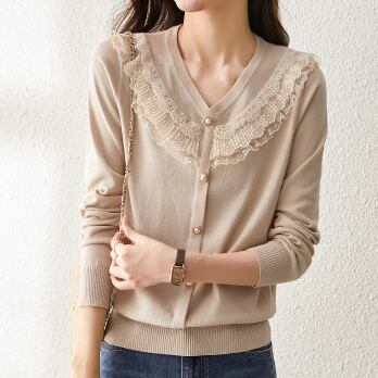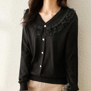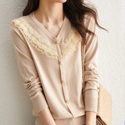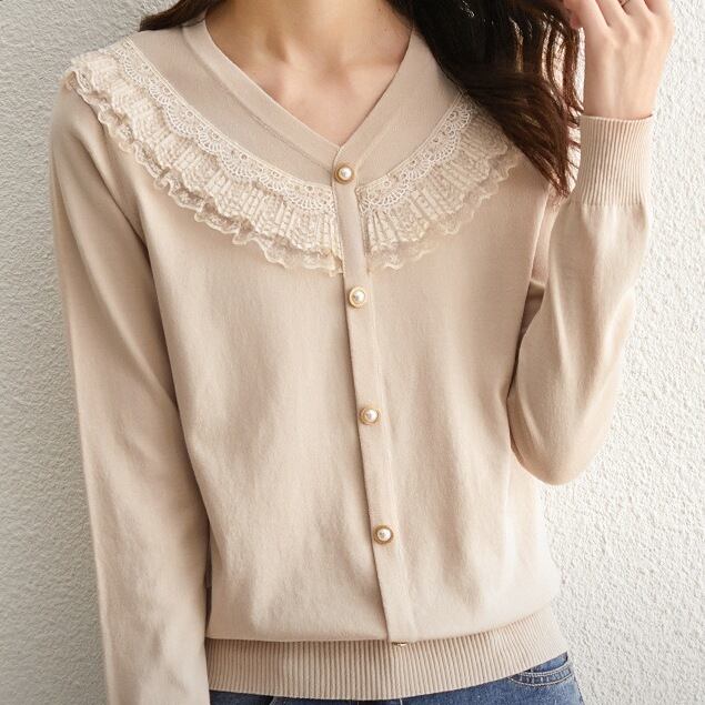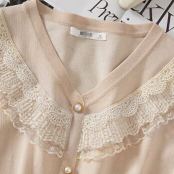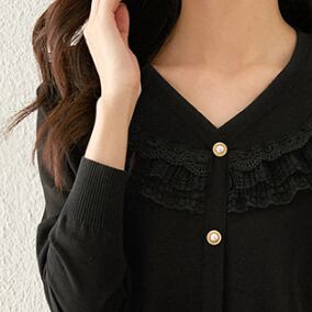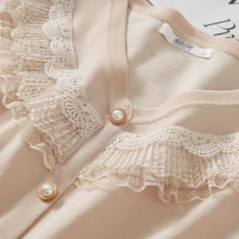 V字にプリーツレースやスカラップレース等のレースをフリル状に重ねた上品で大人可愛いニットトップス。