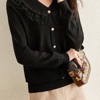 このフリルレース重ねトップスは、カーディガン見えのデザインで、オシャレ感がたっぷり。さりげないパール調のボタンも、女性らしい印象を与えます。Vネックデザインで、首元をすっきり見せるので、ネックレスとの相性もばっちり。フレアのある袖口と、スカラップにカットされたレースのヘムラインが、かわいらしさを存分に表現しています。ミディアム丈で、パンツ、スカートどちらにも合わせやすく、大人可愛いスタイリングにもピッタリです。デートやオフィス、お出かけにも活躍するブラックとベージュの2色展開です。ジャストサイズなので、肌寒い季節にもレイヤードして使えますよ。