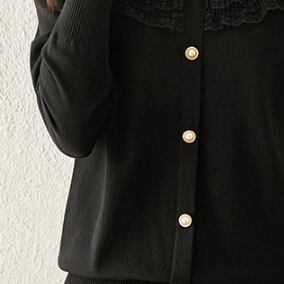 フロントにパール調のボタンが並ぶカーディガン風のデザインで、ノーアクセでもほどよい華やかさがあります。
