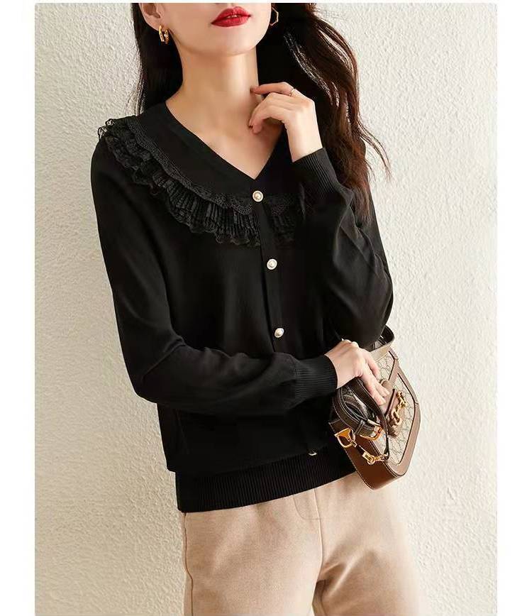 フリルレース重ね パール調ボタン カーディガン見えデザイン トップス セーター ニットソー ミディアム丈 袖あり 長袖 Vネック ニット プリーツレース スカラップカット かわいい 大人可愛い きれいめ シンプル カジュアル 上品 おしゃれ お洒落 ガーリー キュート 甘め フェミニン 清楚 春 秋 冬 レディース 女性用 ママ 女の子 OL 通勤 学生 通学 デート お出かけ 女子会 休日 着回し 普段使い 韓国系 オルチャン ファッション コーデ ハイゲージ S M L XL ブラック ベージュ