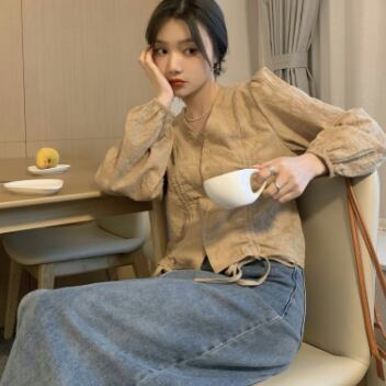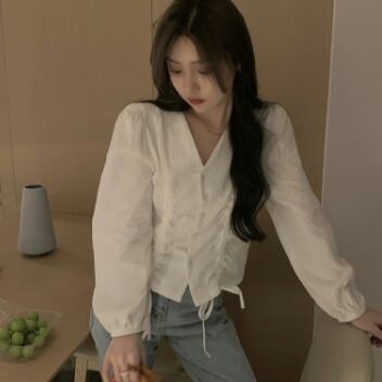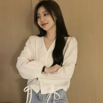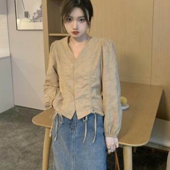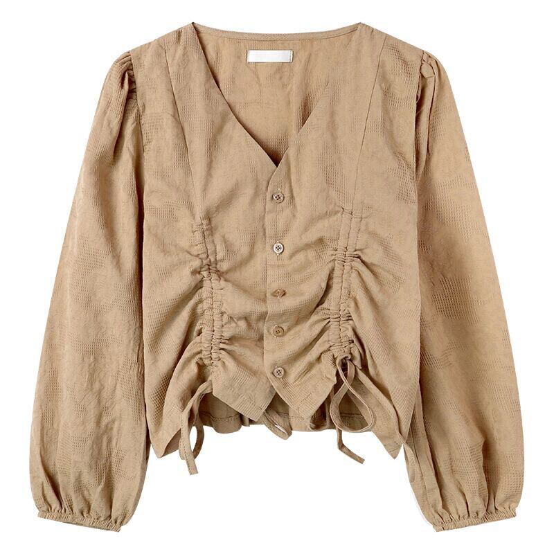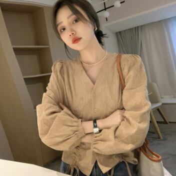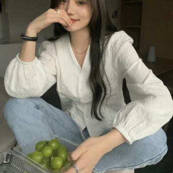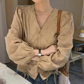 ノーカラーシャツ トップス シャツ ブラウス クラシック スイート ホワイト 白 カーキ レギュラー丈 袖あり 長袖 ボリューム袖 Vネック スリム 細身 タイト シングルブレスト ボタン 大人女子 大人 上品 おしゃれ デイリーウェア レトロ レトロ風 こなれ感 キュート かわいい 女子 個性的 デザイン 主役級 存在感 無地 春 スプリング 20代 10代 30代 レディース 女性用 オフィス ビジネス OL 通勤 学生 学校 通学 ファッション コーデ S M L