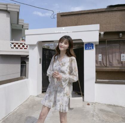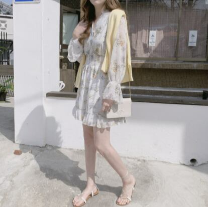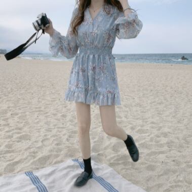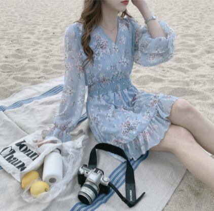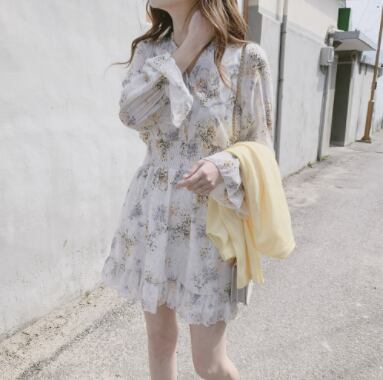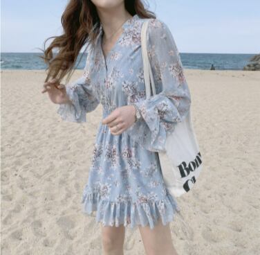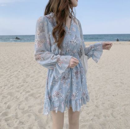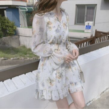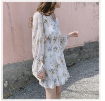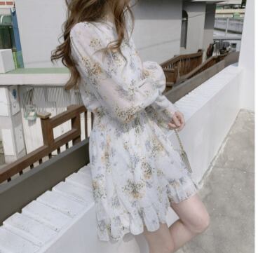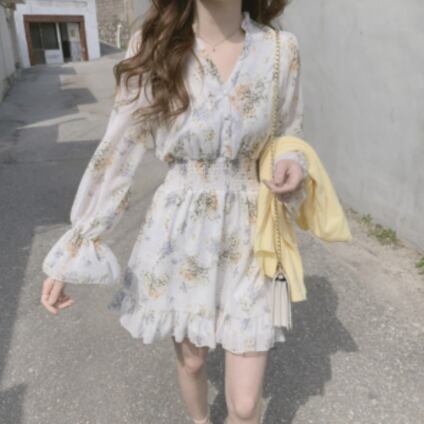 シフォンワンピース スイート ガーリー ホワイト 白 ブルー 青 ミニ丈 ショート丈 袖あり 長袖 Vネック フレア シャーリング ボタン 大人女子 大人 上品 おしゃれ デイリーウェア レトロ レトロ風 こなれ感 キュート かわいい 女子 個性的 デザイン 主役級 存在感 柄 花柄 フラワー 春 スプリング 20代 10代 レディース 女性用 学生 学校 通学 デート お出かけ 女子会 食事会 着回し 普段使い ファッション コーデ S M L XL パステルカラー