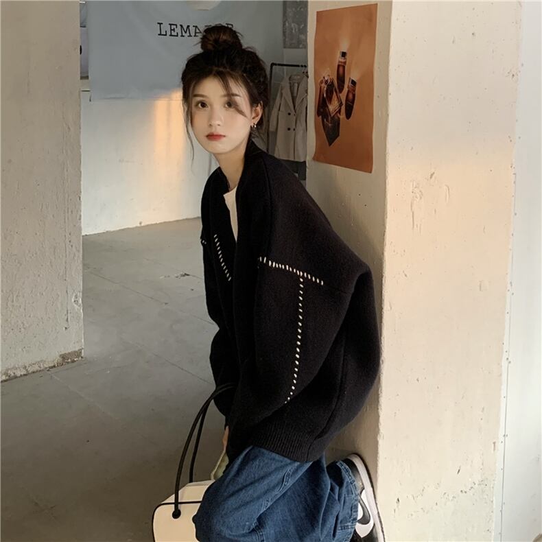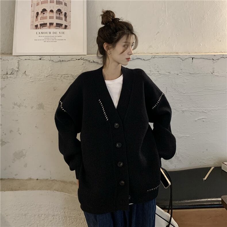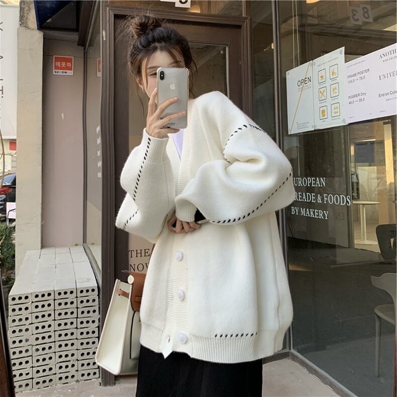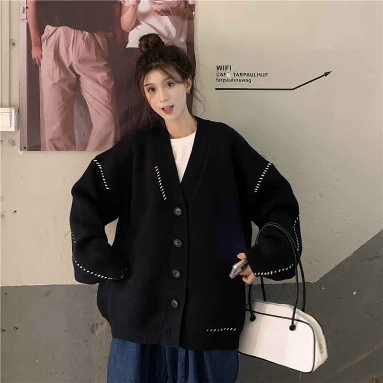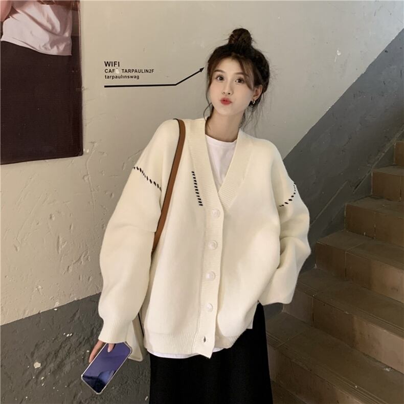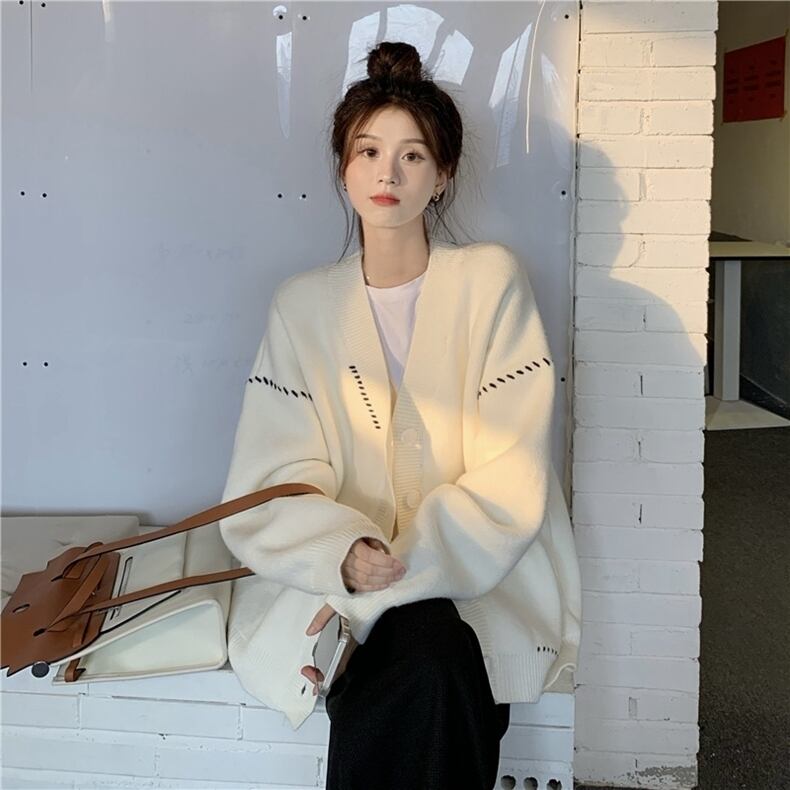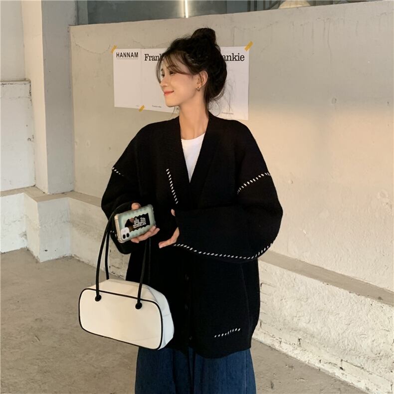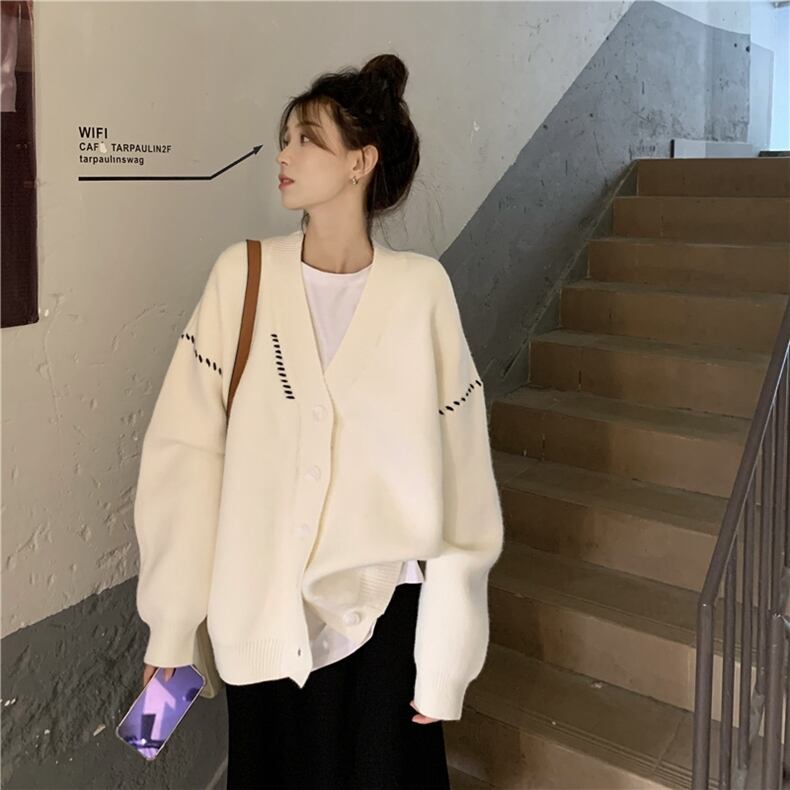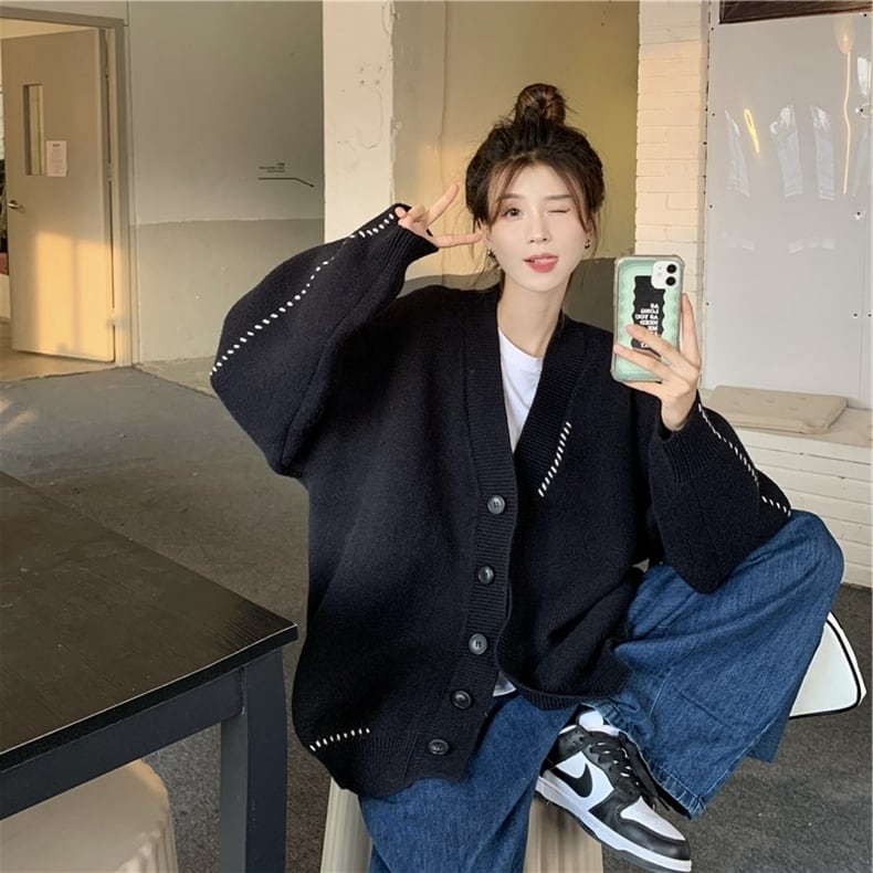 配色ステッチ風ライン オーバーサイズ リラクシー チュニック丈 羽織りもの トップス カーディガン ミディアム丈 袖あり 長袖 ドロップショルダー 萌え袖 Vネック 前開き ニット 大人可愛い シンプル カジュアル おしゃれ お洒落 こなれ感 ルーズ 春 秋 冬 レディース 女性用 女の子 学生 通学 お出かけ 公園デビュー 休日 着回し 普段使い 重ね着 韓国系 オルチャン ファッション S M L XL 大きめ ビックサイズ ゆったり ゆる サイズ 体系カバー ホワイト ブラック モノトーン