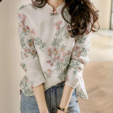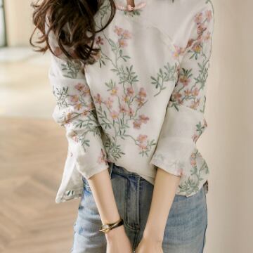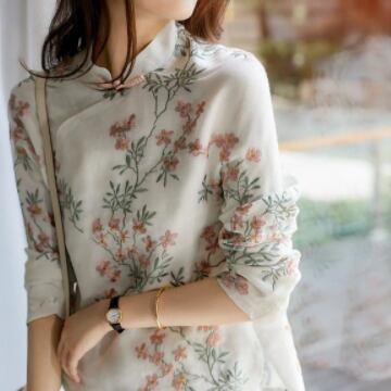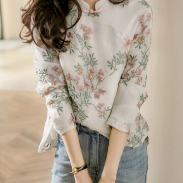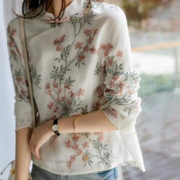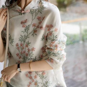 イメージ通りのチャイナカラーに、レトロ感漂う刺繍が映える、チャイナカラーブラウス。適度な薄手の綿素材でお肌にも優しい一枚です。華やかな花柄柄プリントと繊細な刺繍が陰影を作り上げ、着るたびに気分が上がります。また、ミディアム丈で、袖口までしっかりとしたデザインは周囲からの視線もしっかりと独り占め。オフィスでの通勤も、リゾート地でのリラックスタイムもおしゃれにさりげなくコーディネートできます。きれいめにもカジュアルにも合う、使い勝手のよい一枚です。