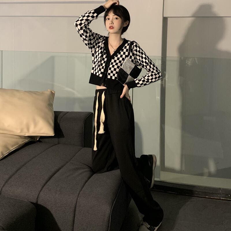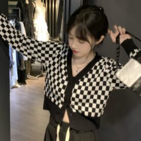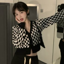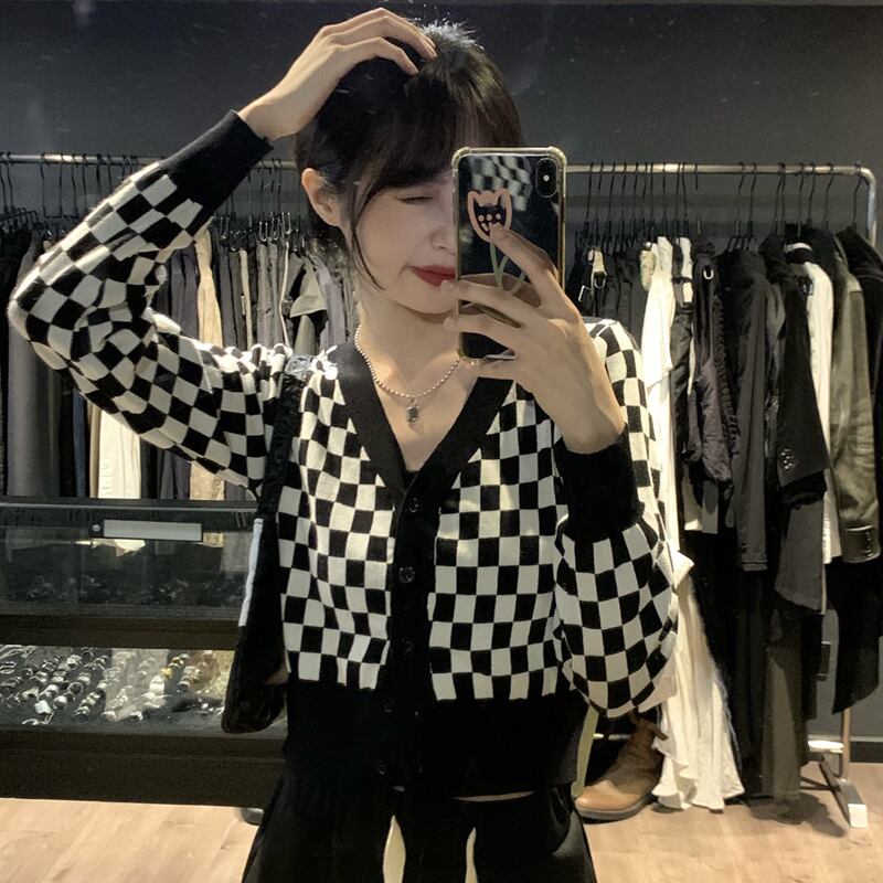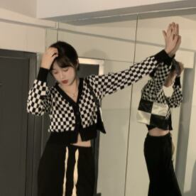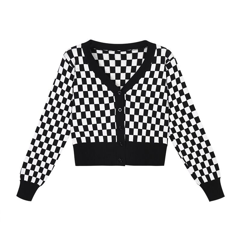チェッカーフラッグ柄 市松模様 インパクト大 デコルテ見せ クロップド丈 スタイルアップ 羽織りもの トップス カーディガン セーター ショート丈 袖あり 長袖 Vネック 襟なし スマート ニット 伸縮性 前開き シンプル カジュアル おしゃれ お洒落 かっこいい 大人女子 メンズライク ボーイッシュ 個性的 クール 存在感 チェック柄 格子柄 春 秋 レディース 女性用 ママ 女の子 学生 通学 お出かけ 休日 普段使い 重ね着 韓国系 オルチャン ファッション 脚長 ブラック×ホワイト モノトーン