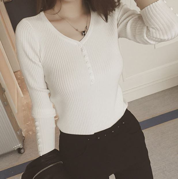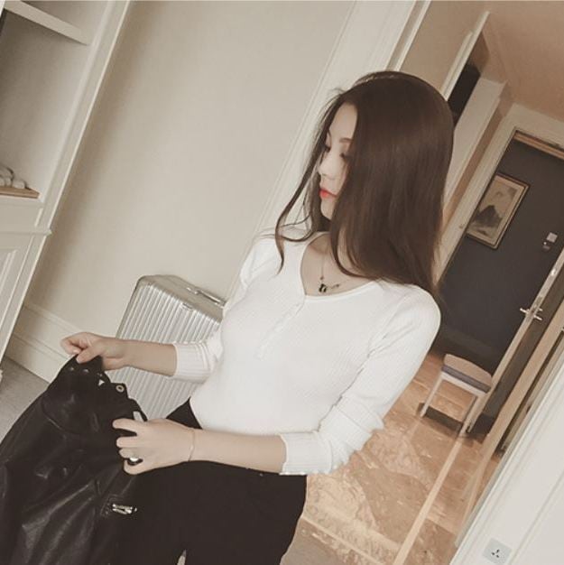 袖口ボタンポイント 首元すっきり V字ヘンリーネック トップス カットソー プルオーバー ミディアム丈 袖あり 九分袖 長袖 Vネック 襟なし スリム タイト 細身 リブ 伸縮性 シンプル カジュアル おしゃれ お洒落 ボーイッシュ メンズライク 抜け感 無地 春 秋 レディース 女性用 女の子 ママ 学生 通学 お出かけ 休日 着回し 普段使い 重ね着 韓国系 オルチャン ファッション 定番 ベーシック プチプラ 安い 合わせやすい フリーサイズ ホワイト ブラック ブラウン グレー カラバリ