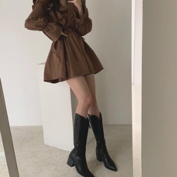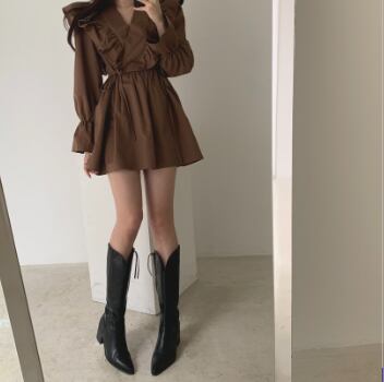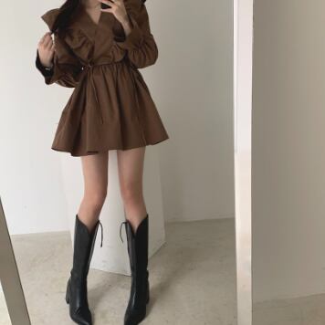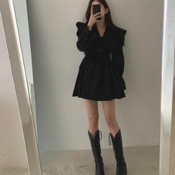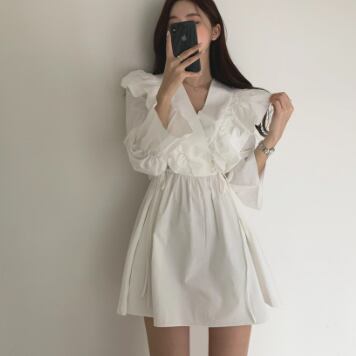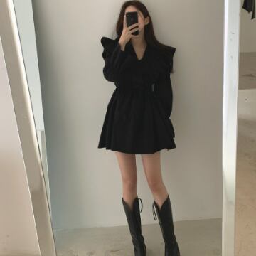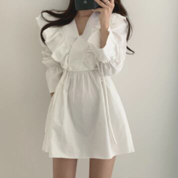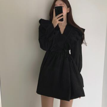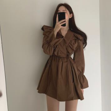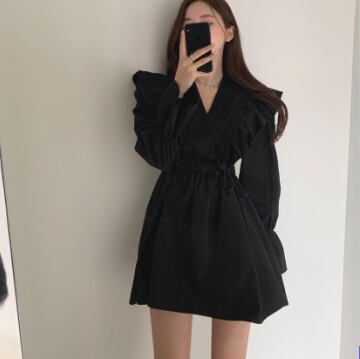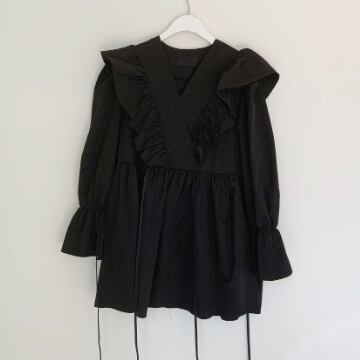 フリルワンピース トップス スイート ガーリー ブラック 黒 ホワイト 白 ブラウン 茶色 ミニ丈 ショート丈 袖あり 長袖 ボリューム袖 Vネック Aライン フリル 綿 コットン 大人女子 大人 上品 おしゃれ デイリーウェア レトロ レトロ風 こなれ感 キュート かわいい 女子 個性的 デザイン 主役級 存在感 無地 春 スプリング 20代 10代 レディース 女性用 学生 学校 通学 デート お出かけ 女子会 食事会 着回し 普段使い S M L XL