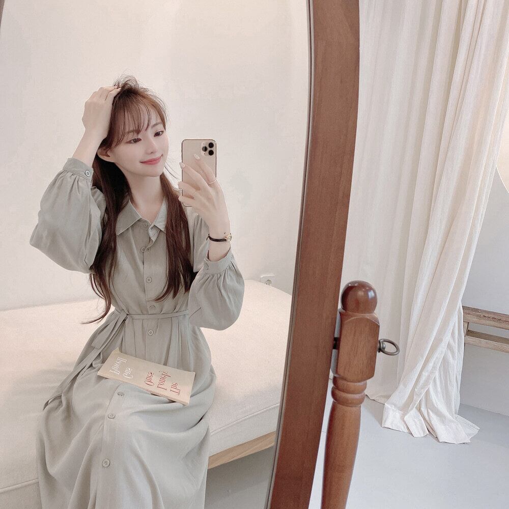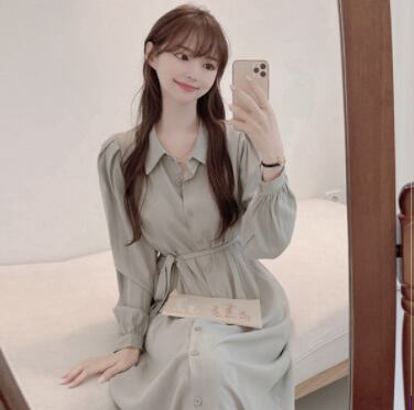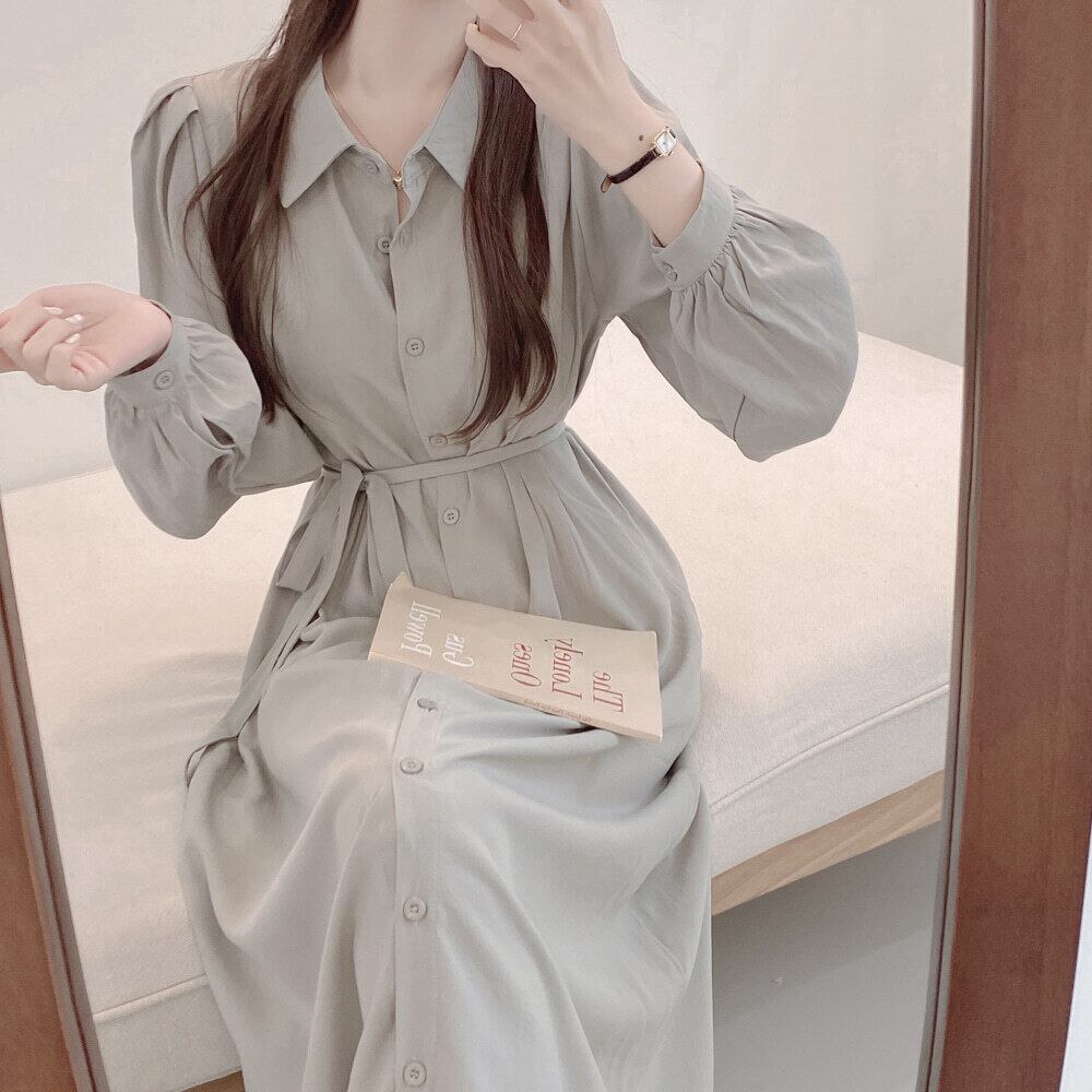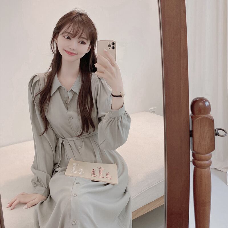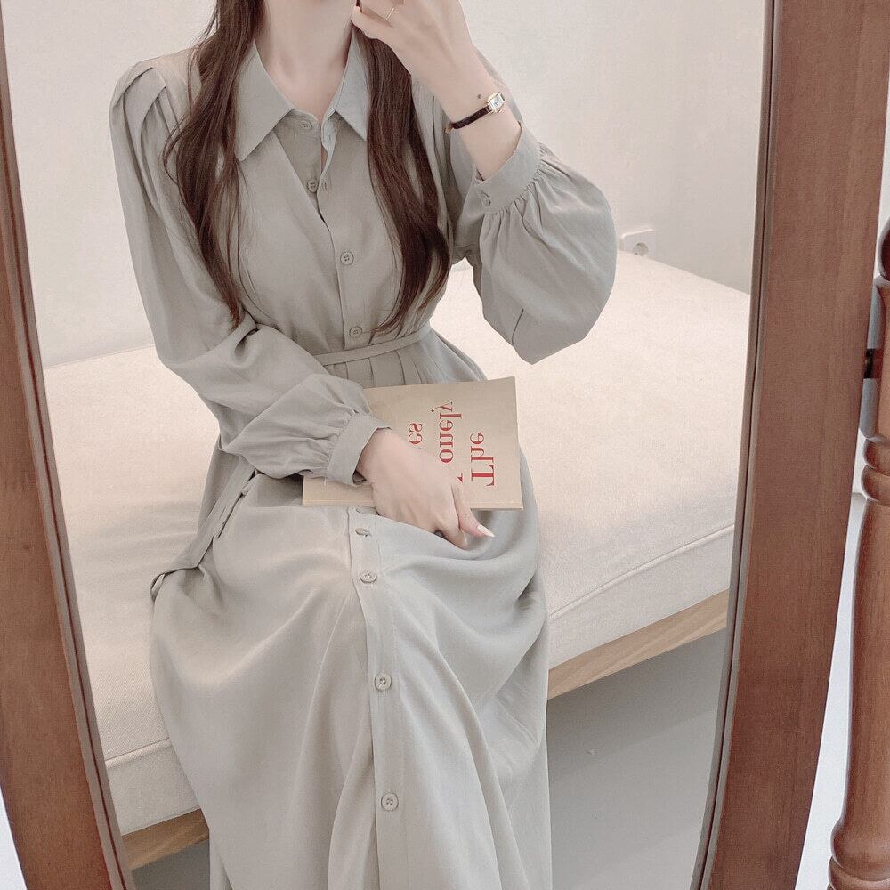 シャツワンピース トップス シャツ ブラウス シンプル グリーン 緑 カーキ ミドル丈 ロング丈 袖あり 長袖 ボリューム袖 襟付き シングルブレスト ボタン 大人女子 大人 上品 おしゃれ きれいめ シンプル デイリーウェア レトロ レトロ風 こなれ感 主役級 存在感 無地 春 スプリング 秋 オータム 20代 10代 30代 40代 レディース 女性用 オフィス ビジネス OL 通勤 学生 学校 通学 デート お出かけ 女子会 食事会 着回し 普段使い S M L