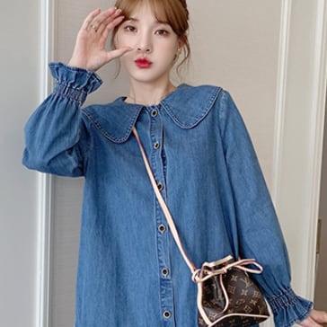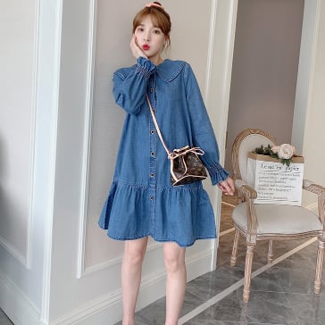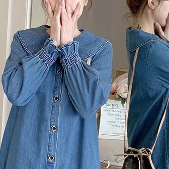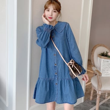 デニムワンピース トップス カジュアル ブルー 青 ミディアム丈 ショート丈 袖あり 長袖 襟付き Aライン フリル 大人女子 大人 上品 おしゃれ デイリーウェア レトロ レトロ風 こなれ感 ルーズ シルエット ラフ キュート かわいい 女子 個性的 デザイン 主役級 存在感 無地 春 スプリング 20代 10代 レディース 女性用 マタニティ 学生 学校 通学 着回し 普段使い 暖かい 防寒 M L XL 2XL 3XL 4XL くすみカラー 大きいサイズ