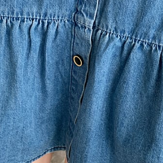 デニムワンピースは、幅広いコーディネートに取り入れることができる大人カジュアルなアイテムです。トップスとしても、ワンピースとしても着こなせるので、スタイリングの幅が広がります。ショート丈のフリル、Aラインのシルエットに加え、襟付きのディテールで上品さもプラス。