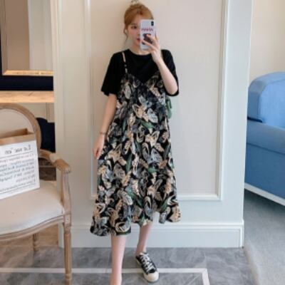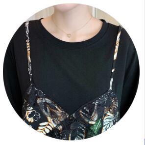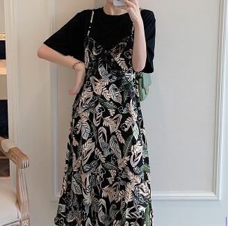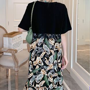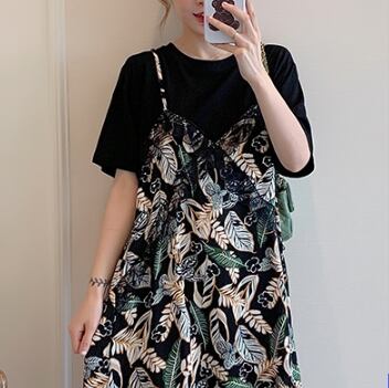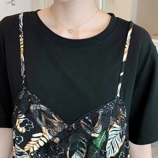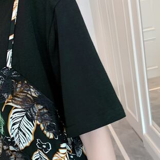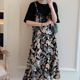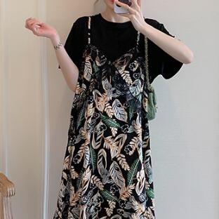 Tシャツワンピース フェイクツーピース ガーリー ブラック 黒 ミドル丈 袖あり 半袖 ラウンドネック フリル 大人女子 大人 上品 おしゃれ デイリーウェア レトロ レトロ風 こなれ感 キュート かわいい 女子 個性的 デザイン 主役級 存在感 柄 リーフ柄 ボタニカル 夏 サマー 20代 10代 30代 レディース 女性用 学生 学校 通学 休日 おうち らくちん 着回し 普段使い 重ね着 レイヤード M L XL 2XL 3XL 4XL 大きいサイズ