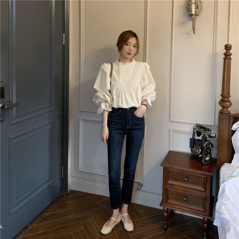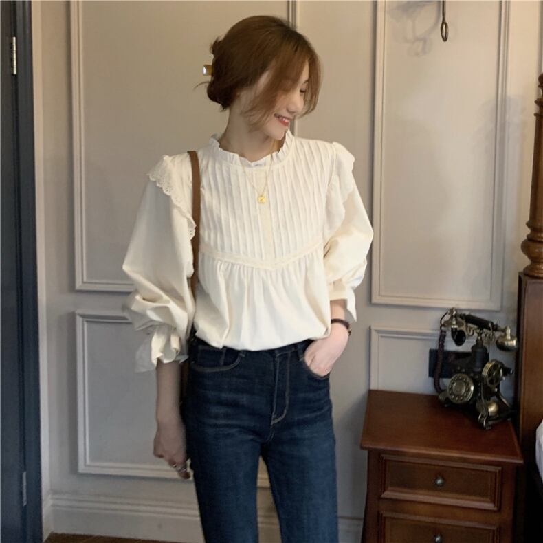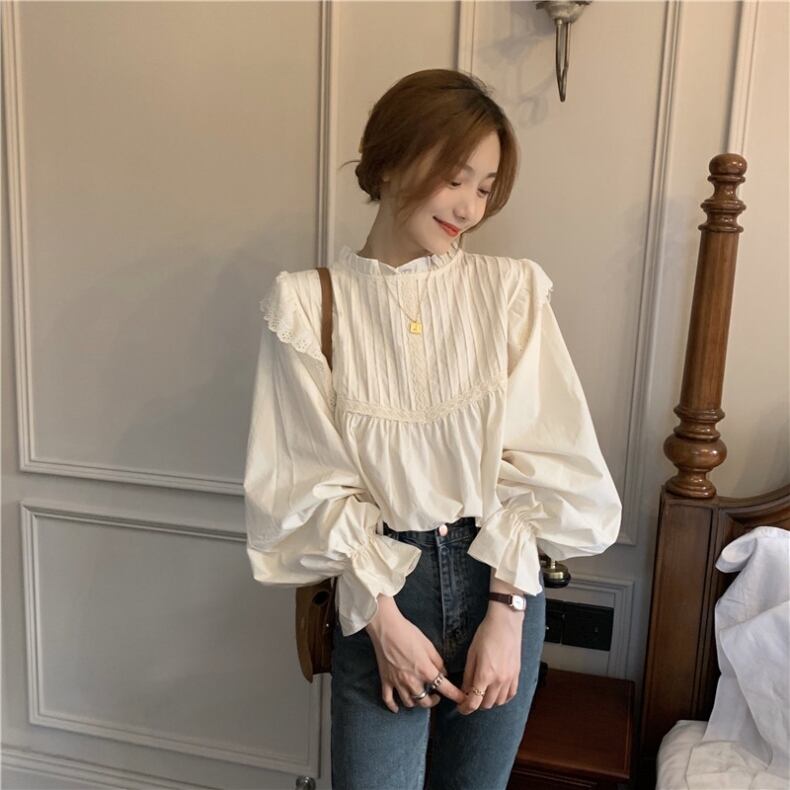 長袖フリルシャツ トップス シャツ ブラウス スイート ガーリー アプリコット レギュラー丈 袖あり 長袖 スタンドカラー フリル 大人女子 大人 上品 おしゃれ エレガント デイリーウェア レトロ レトロ風 こなれ感 ルーズ シルエット ラフ キュート かわいい 女子 個性的 デザイン 主役級 存在感 無地 春 スプリング 20代 10代 30代 レディース 女性用 オフィス ビジネス OL 通勤 学生 学校 通学 着回し 普段使い ファッション コーデ S M L