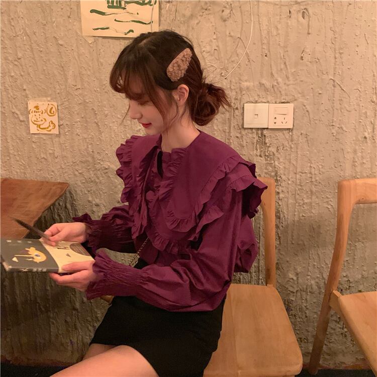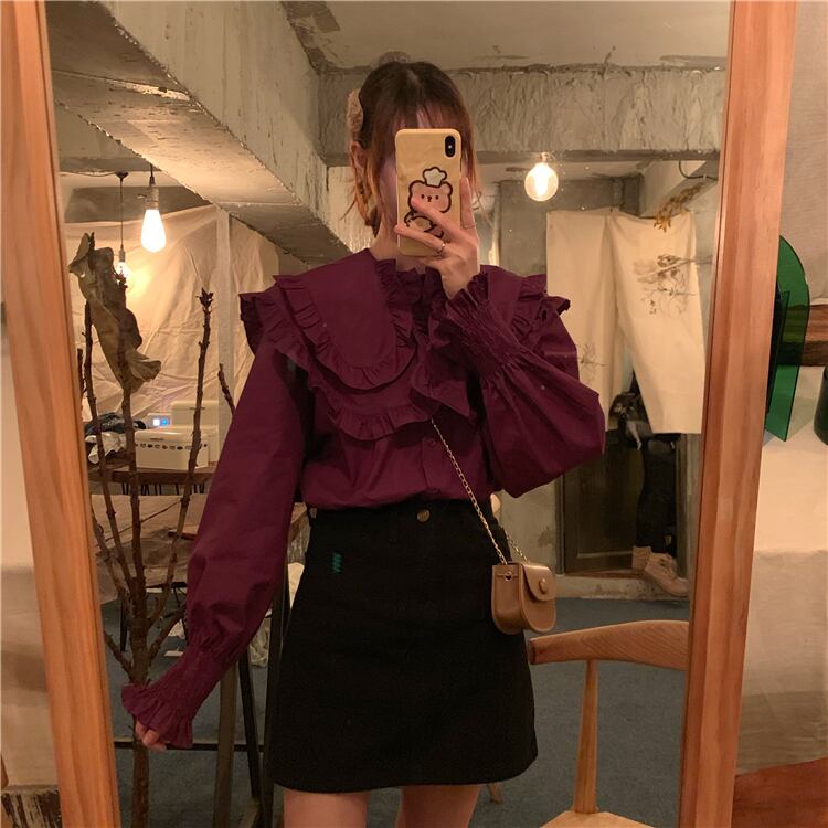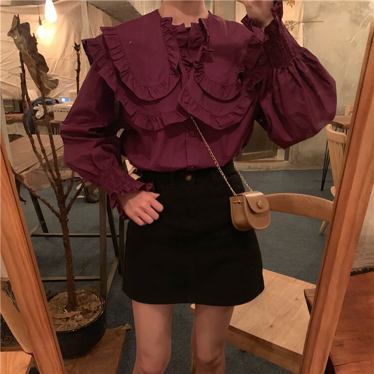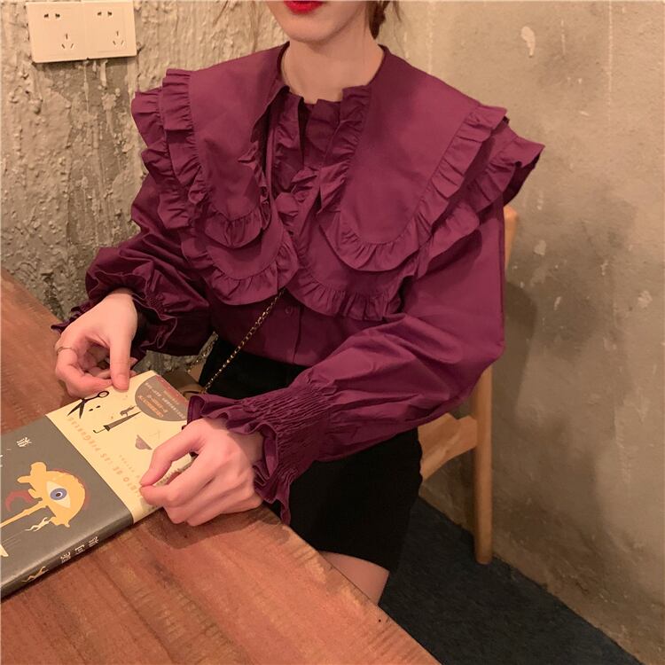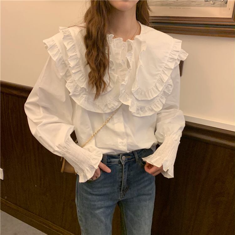 ドールカラーシャツ トップス シャツ ブラウス スイート ガーリー ラブリー ホワイト 白 レッド 赤 レギュラー丈 袖あり 長袖 襟付き シャーリング フリル 大人女子 大人 上品 おしゃれ デイリーウェア レトロ レトロ風 こなれ感 ルーズ シルエット ラフ キュート かわいい 女子 個性的 デザイン 主役級 存在感 無地 春 スプリング 20代 10代 30代 レディース 女性用 オフィス ビジネス OL 通勤 学生 学校 通学 着回し 普段使い ワンサイズ