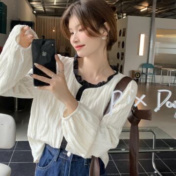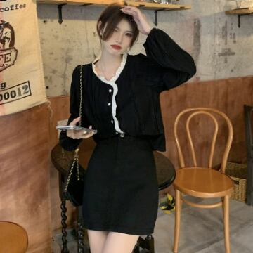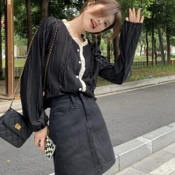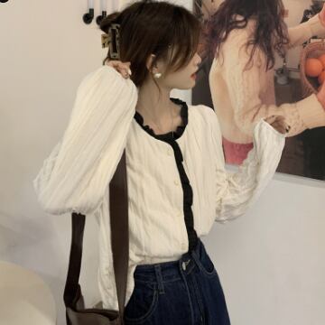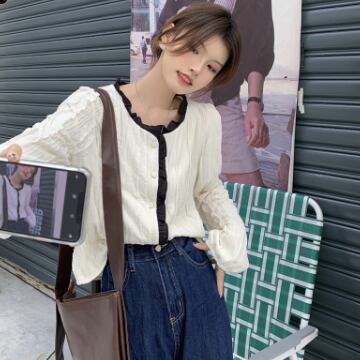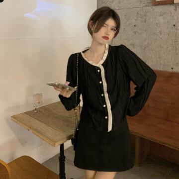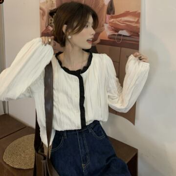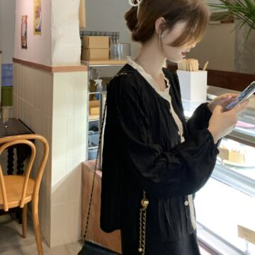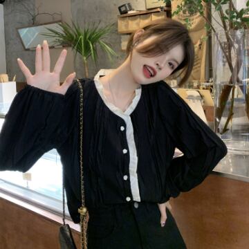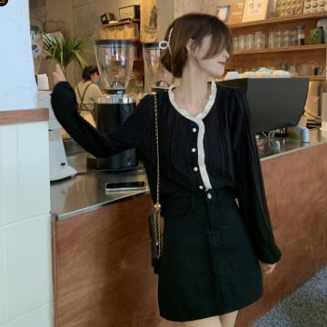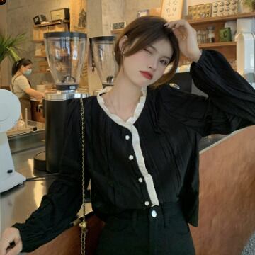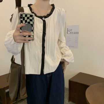 バイカラーシャツ トップス シャツ ブラウス シンプル スイート ブラック 黒 アプリコット レギュラー丈 袖あり 長袖 ラウンドネック ストレート シングルブレスト ボタン フリル 大人女子 大人 上品 おしゃれ デイリーウェア レトロ レトロ風 こなれ感 キュート かわいい 女子 個性的 デザイン 主役級 存在感 無地 春 スプリング 20代 10代 レディース 女性用 オフィス ビジネス OL 通勤 学生 学校 通学 着回し 普段使い ワンサイズ パステルカラー