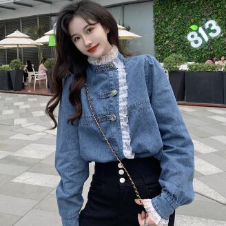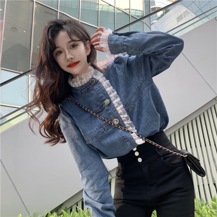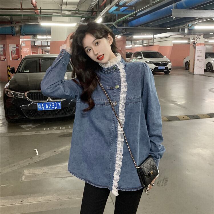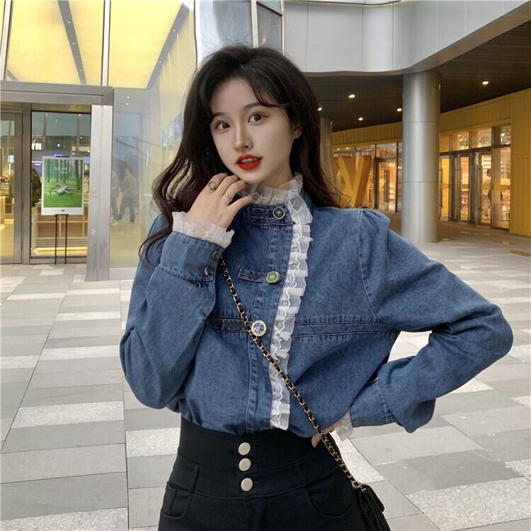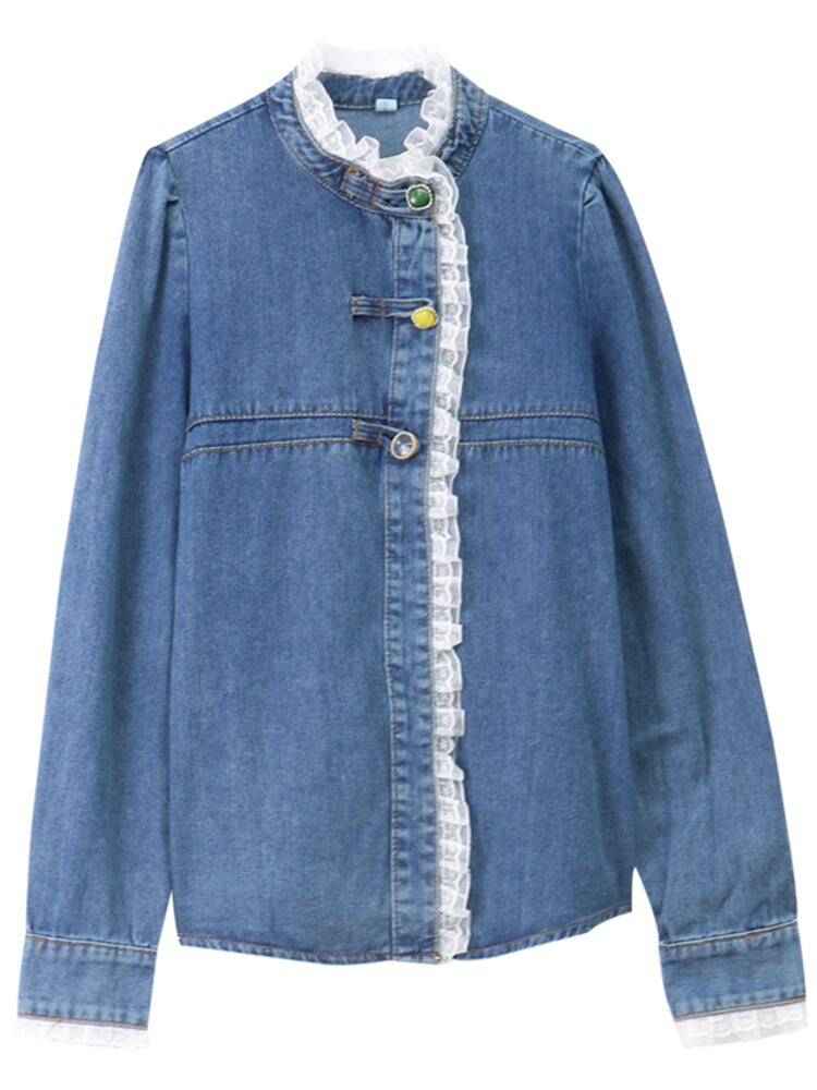 デニムレースシャツ トップス シャツ ブラウス スイート ブルー 青 レギュラー丈 袖あり 長袖 スタンドカラー レース 大人女子 大人 上品 おしゃれ きれいめ シンプル デイリーウェア レトロ レトロ風 こなれ感 キュート かわいい 女子 個性的 デザイン 主役級 存在感 無地 春 スプリング 20代 10代 レディース 女性用 学生 学校 通学 デート お出かけ 女子会 食事会 着回し 普段使い トレンド ファッション コーデ ワンサイズ パステルカラー
