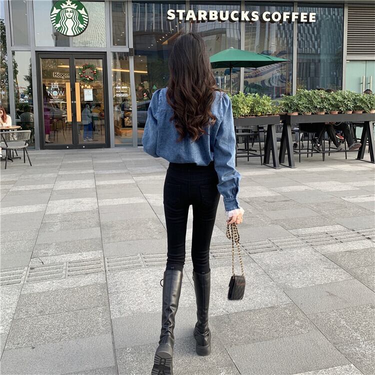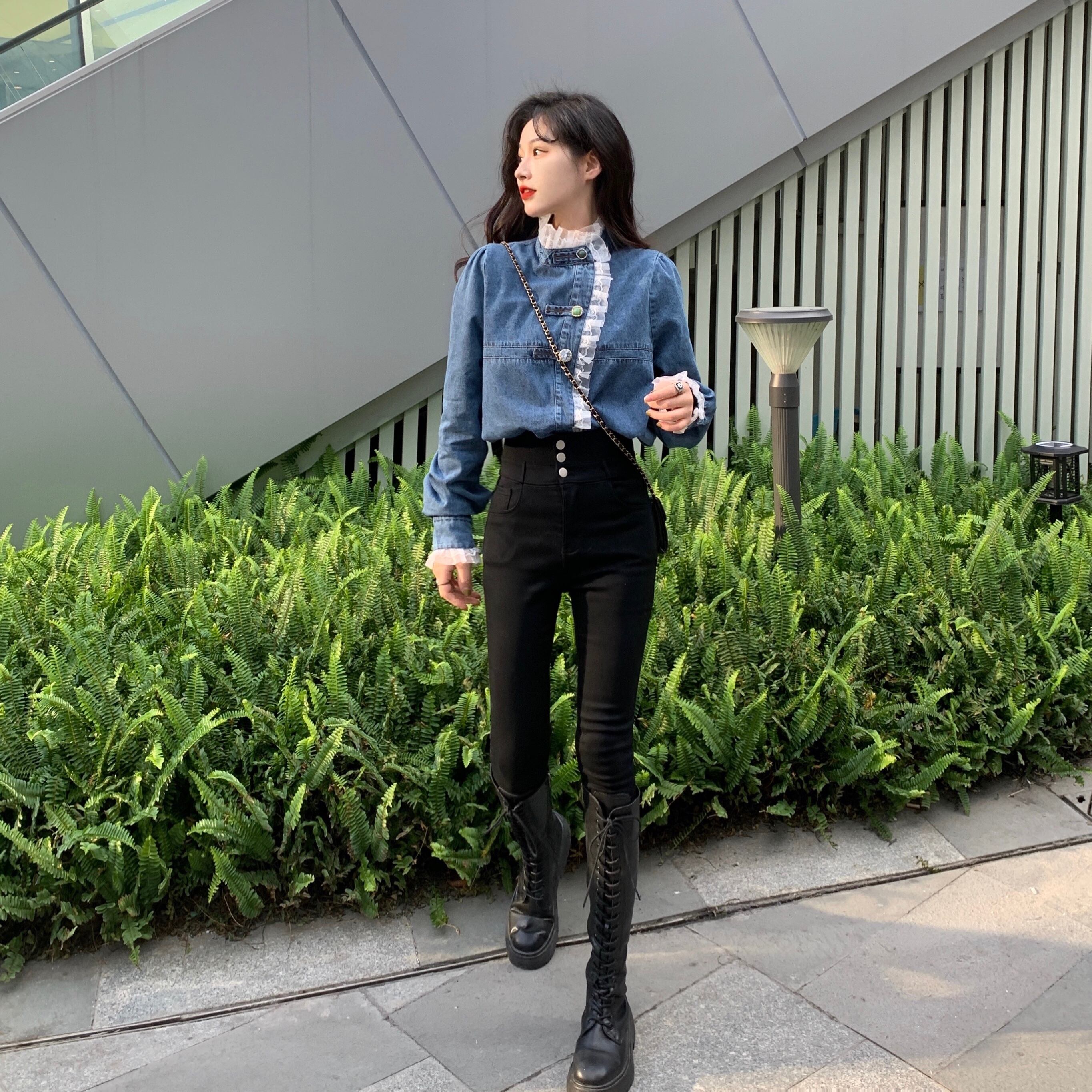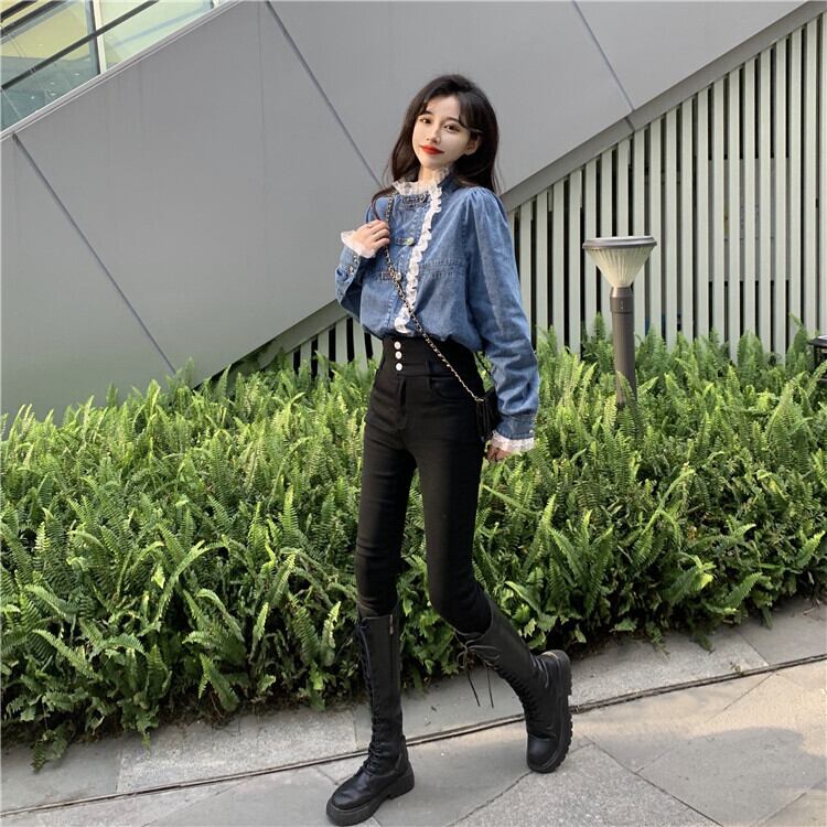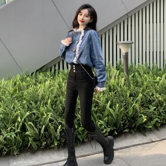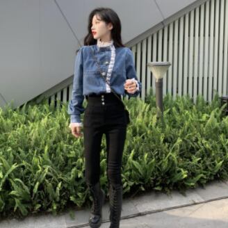レース×デニムの長袖シャツ