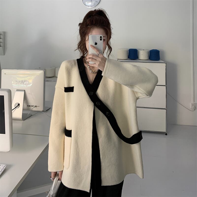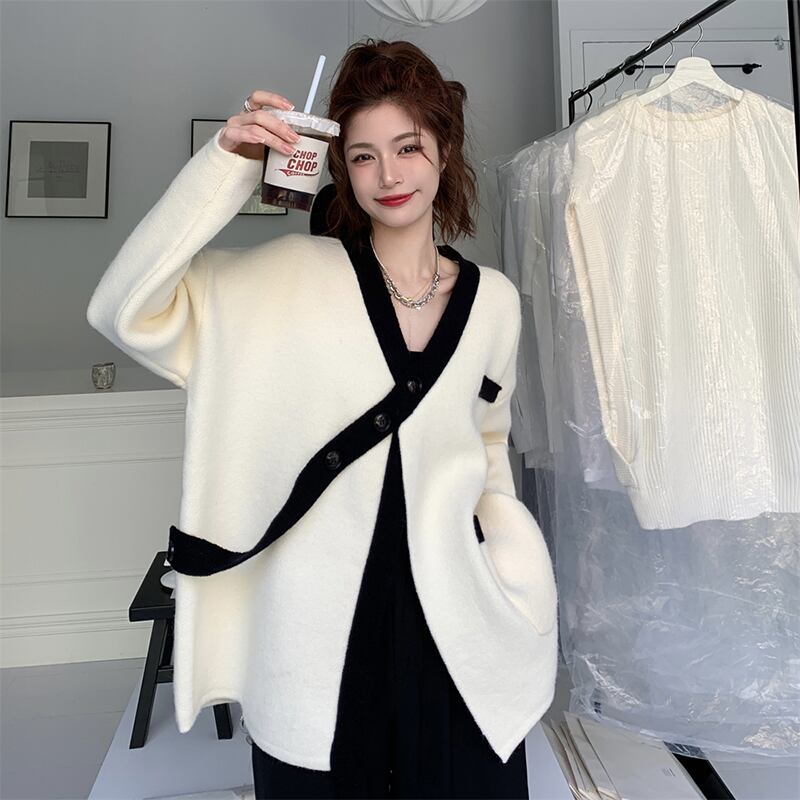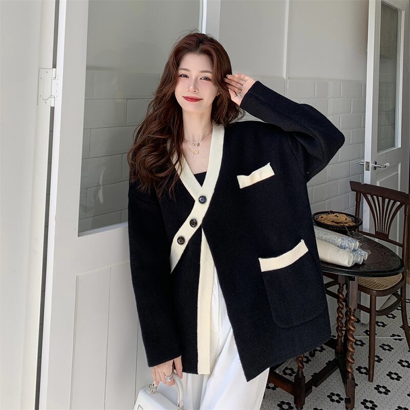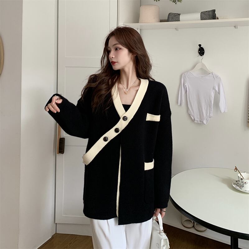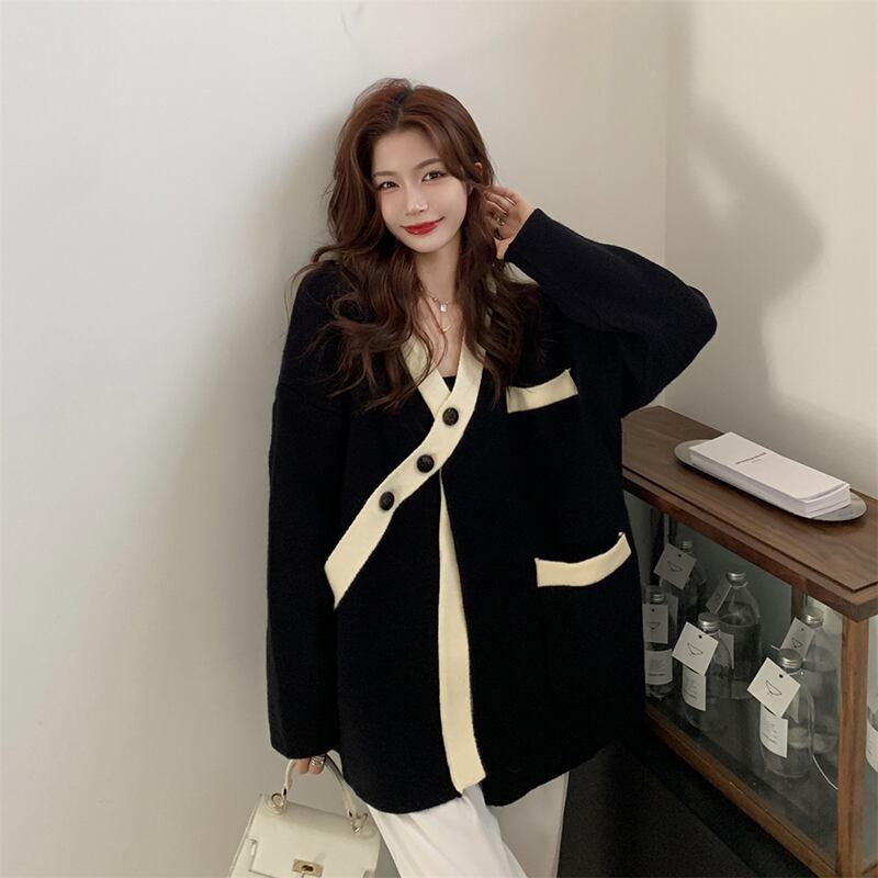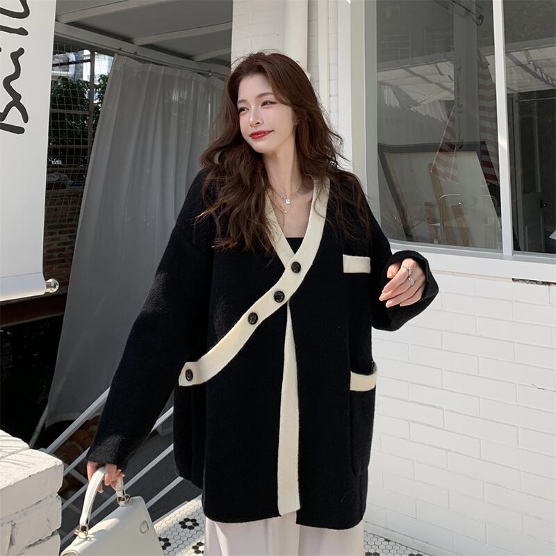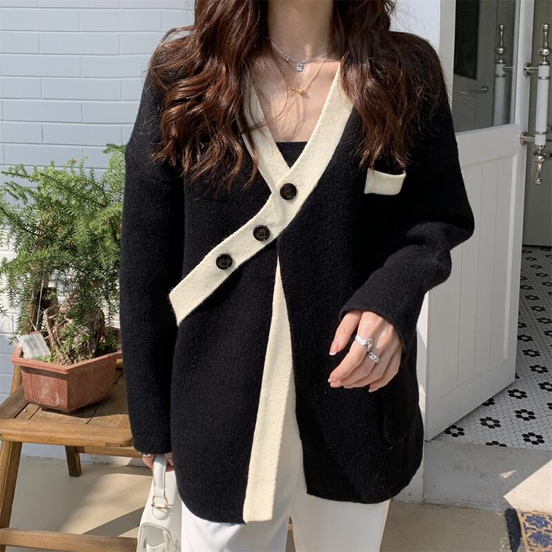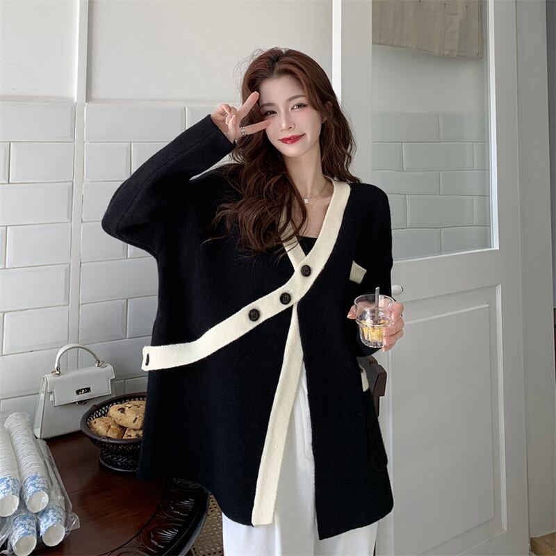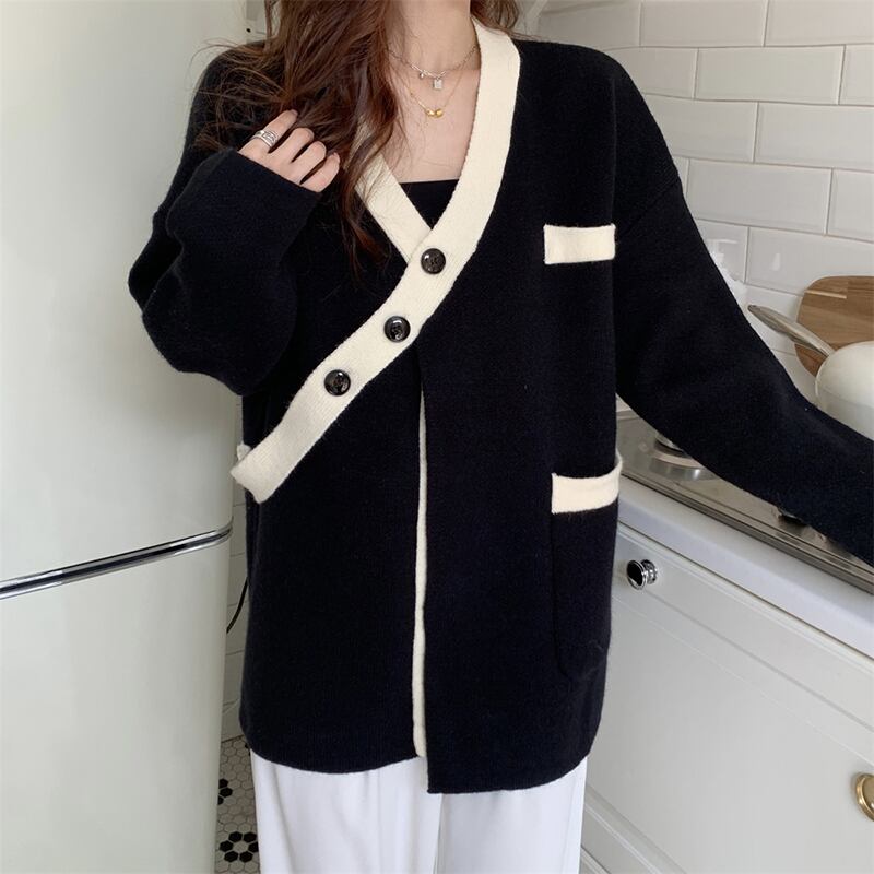 カーディガン トップス ニット セーター モダン ブラック 黒 アプリコット ミディアム丈 袖あり 長袖 Vネック ストレート ボタン 大人女子 大人 上品 おしゃれ きれいめ シンプル デイリーウェア レトロ レトロ風 こなれ感 ルーズ シルエット ラフ 個性的 デザイン 主役級 存在感 柄 配色 コントラストカラー 春 スプリング 秋 オータム 20代 10代 30代 40代 レディース 女性用 オフィス ビジネス OL 通勤 着回し 普段使い ワンサイズ モノトーン