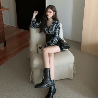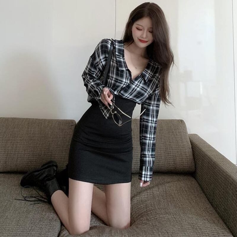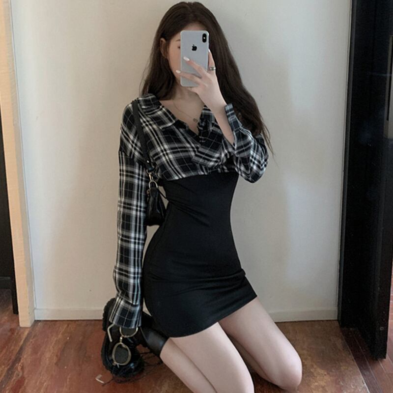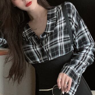 チェック柄シャツとブラックスカートの切替えデザインワンピースです。