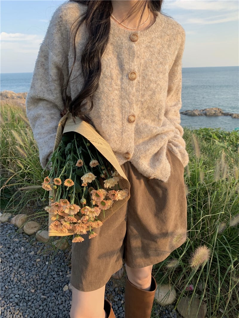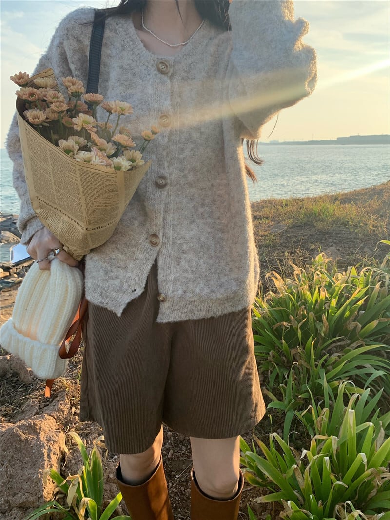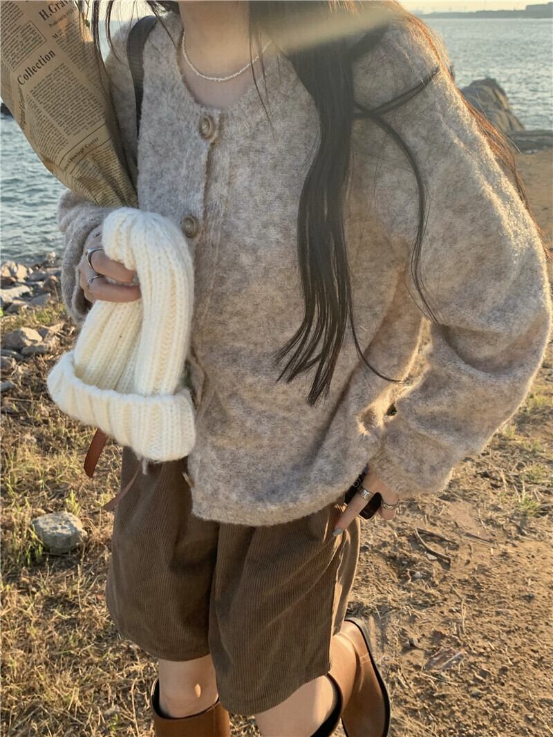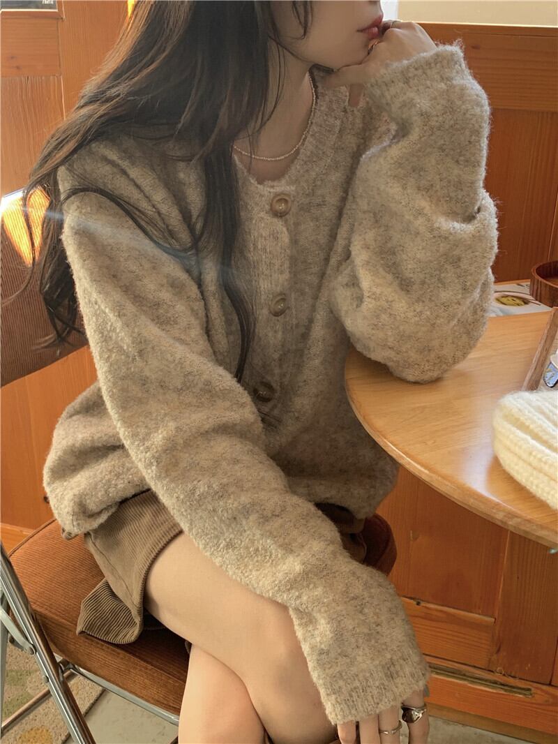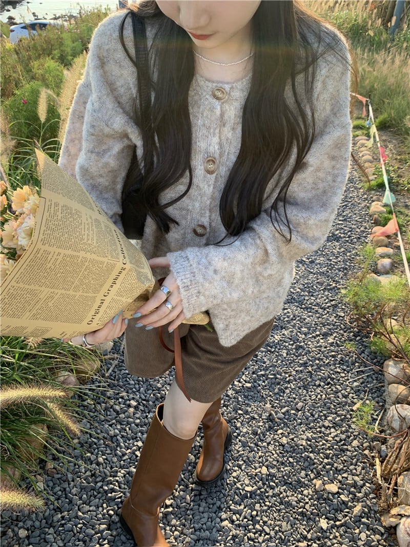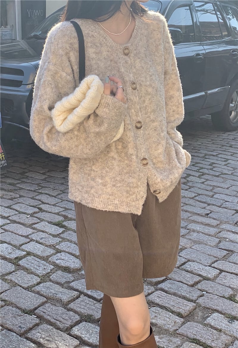 雰囲気のある杢調の色合いとマーブルボタンがほっこり優しげな雰囲気のニットカーディガン。