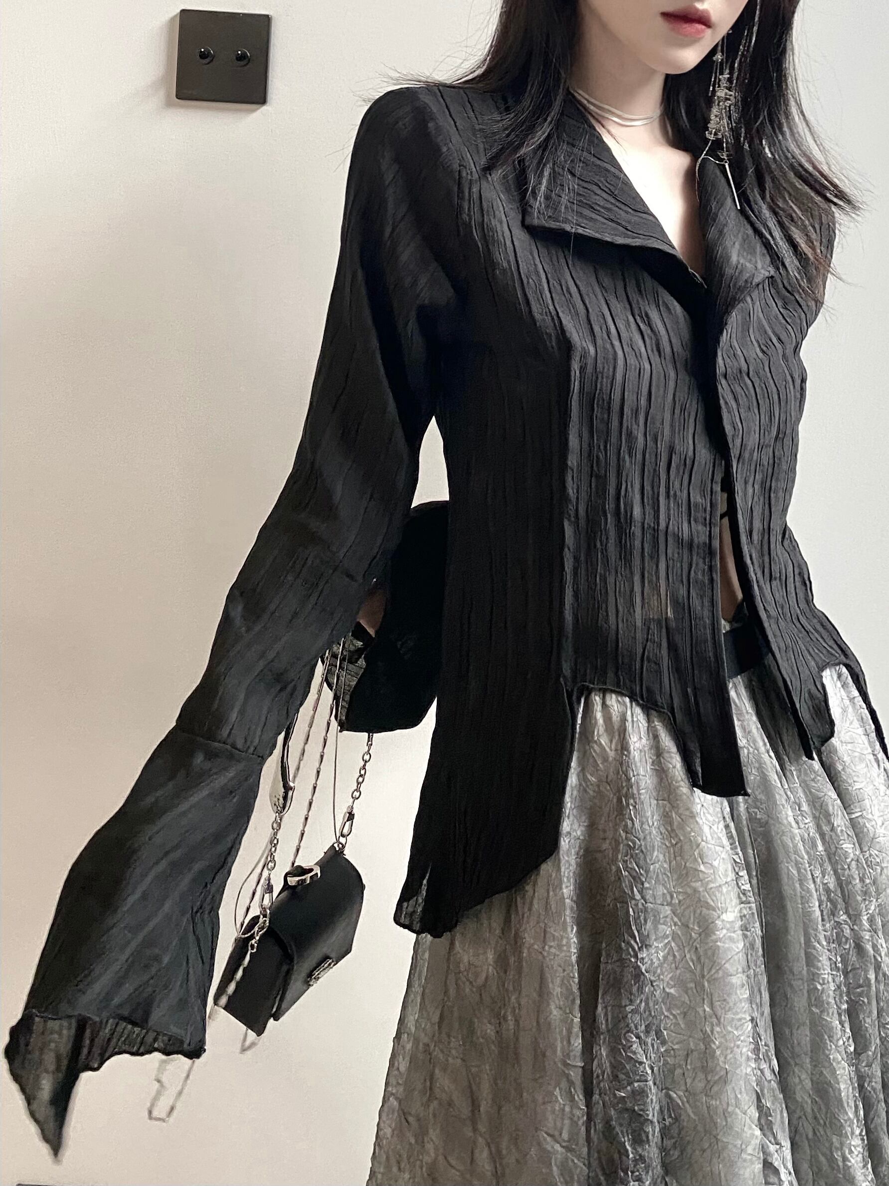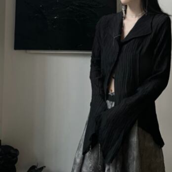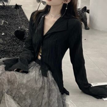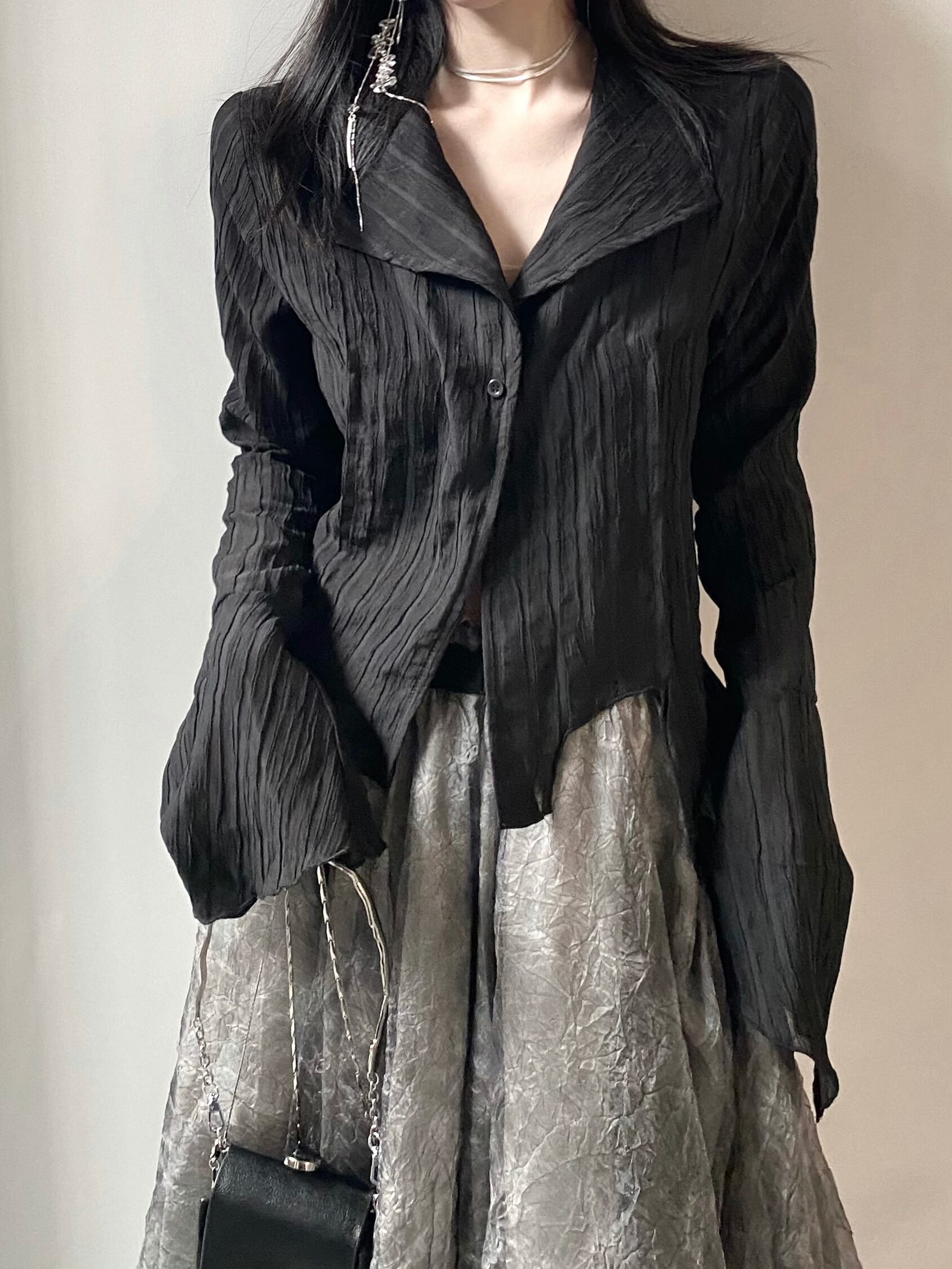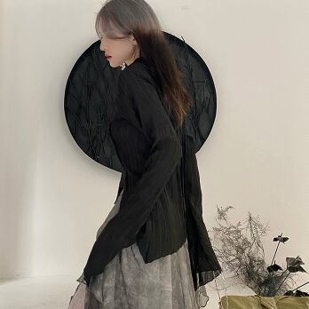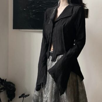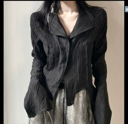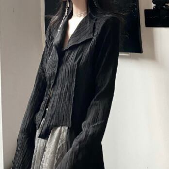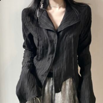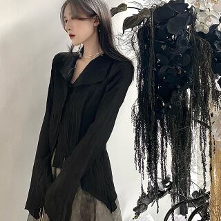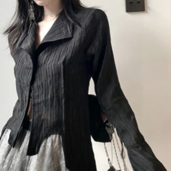 デザインシャツ トップス シャツ ブラウス ストリート ブラック 黒 レギュラー丈 袖あり 長袖 ボリューム袖 襟付き スリム 細身 タイト ボタン 大人女子 大人 上品 おしゃれ かっこいい クール デイリーウェア レトロ レトロ風 こなれ感 ルーズ シルエット ラフ 個性的 デザイン 主役級 存在感 無地 春 スプリング 夏 サマー 20代 10代 レディース 女性用 学生 学校 通学 デート お出かけ 女子会 食事会 着回し 普段使い S M L