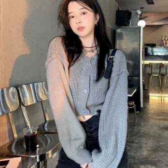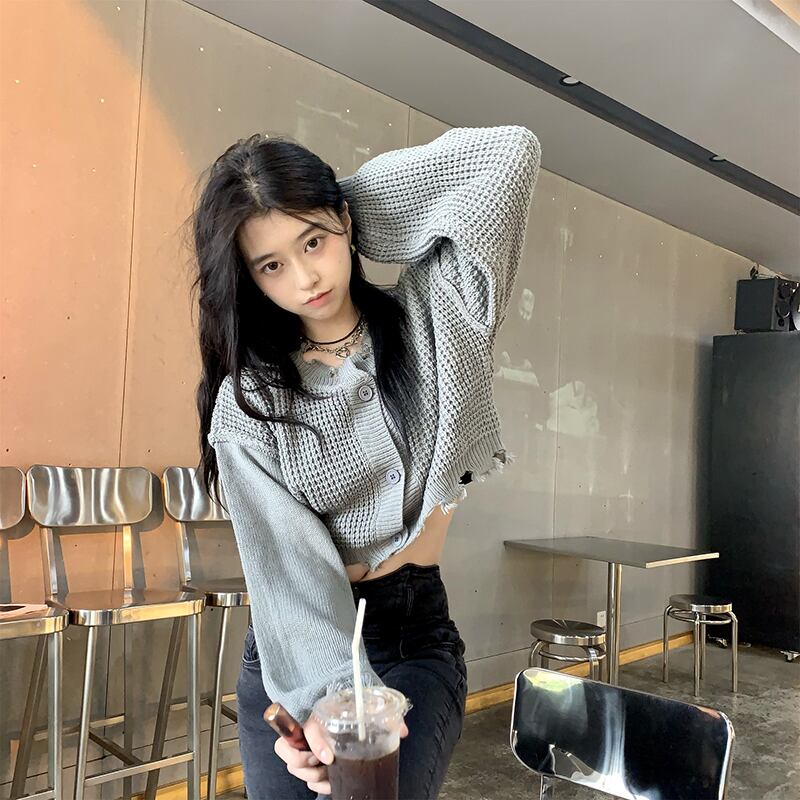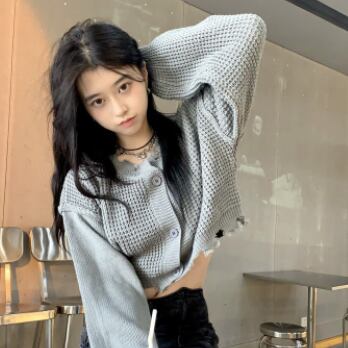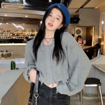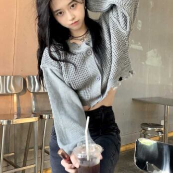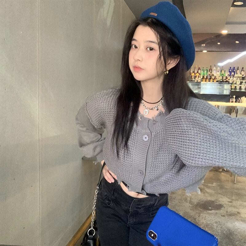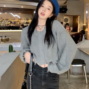 デザインカーディガン トップス セーター ストリート グレー 灰色 ミニ丈 ショート丈 袖あり 長袖 ラウンドネック シングルブレスト ボタン 大人女子 大人 上品 おしゃれ デイリーウェア レトロ レトロ風 こなれ感 キュート かわいい 女子 個性的 デザイン 主役級 存在感 無地 春 スプリング 20代 10代 レディース 女性用 学生 学校 通学 デート お出かけ 女子会 食事会 着回し 普段使い 重ね着 レイヤード ファッション コーデ ワンサイズ