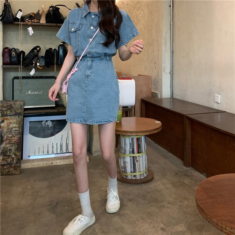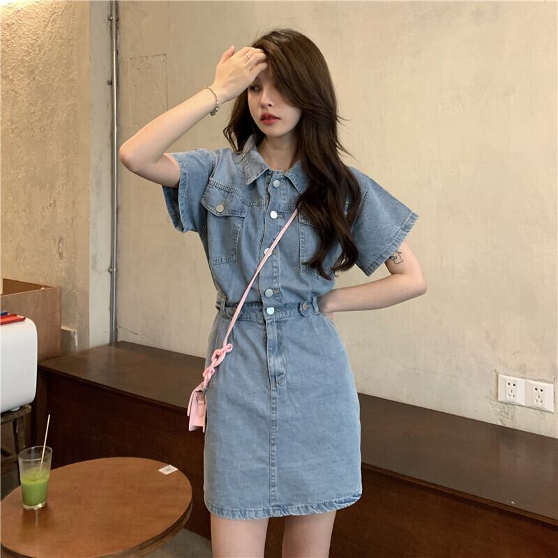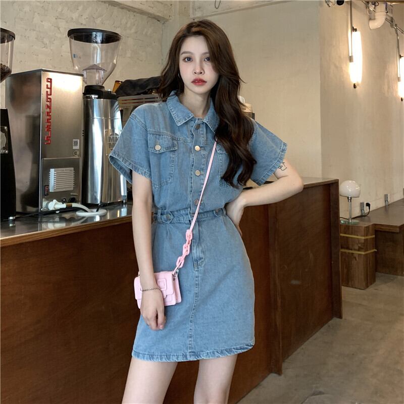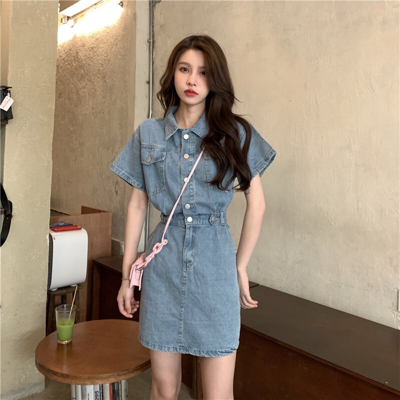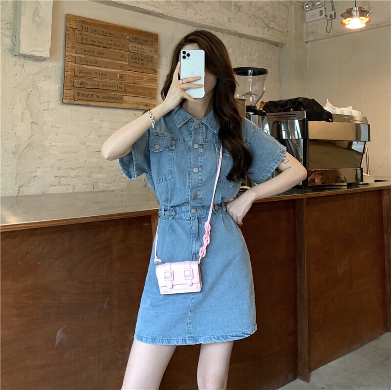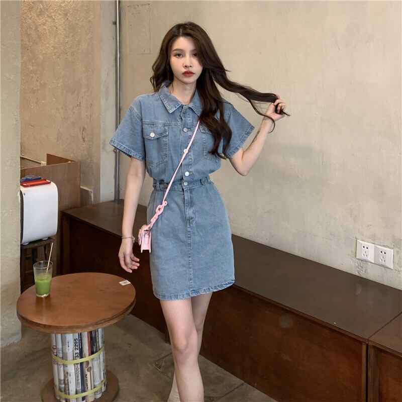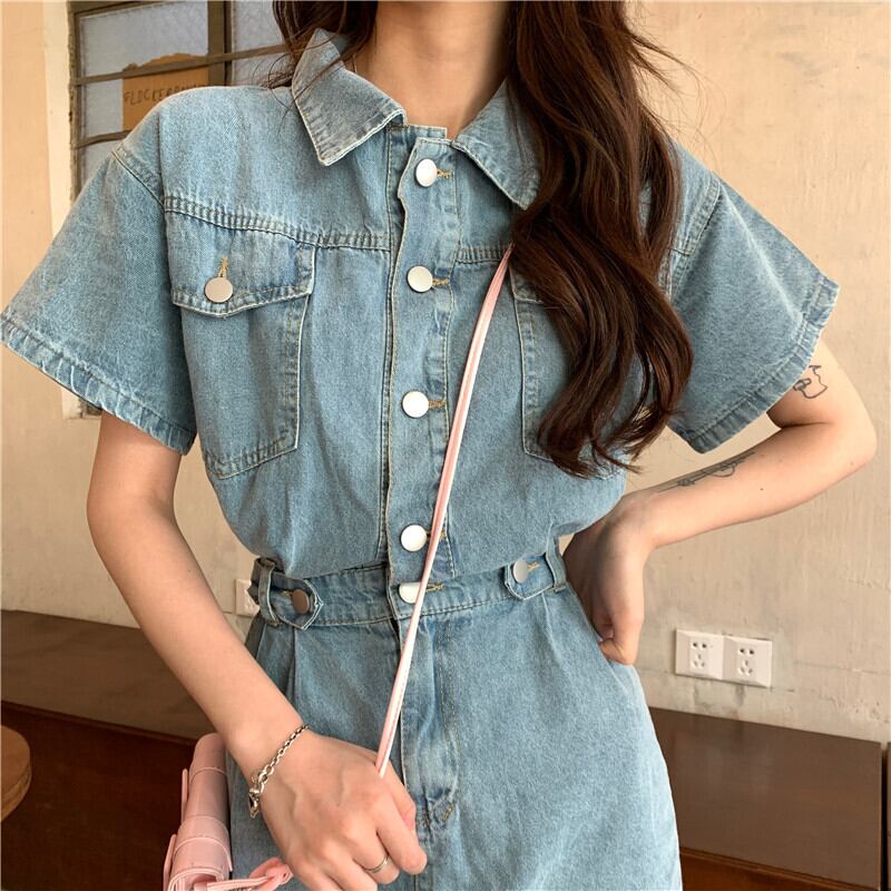 デニムワンピース カジュアル ブルー 青 ミニ丈 ショート丈 袖あり 半袖 襟付き スリム 細身 タイト ボタン ポケット 大人女子 大人 上品 おしゃれ デイリーウェア レトロ レトロ風 こなれ感 個性的 デザイン 主役級 存在感 無地 春 スプリング 夏 サマー 20代 10代 レディース 女性用 学生 学校 通学 デート お出かけ 女子会 食事会 着回し 普段使い トレンド ファッション コーデ 美脚 足長 細見え スタイル S M L