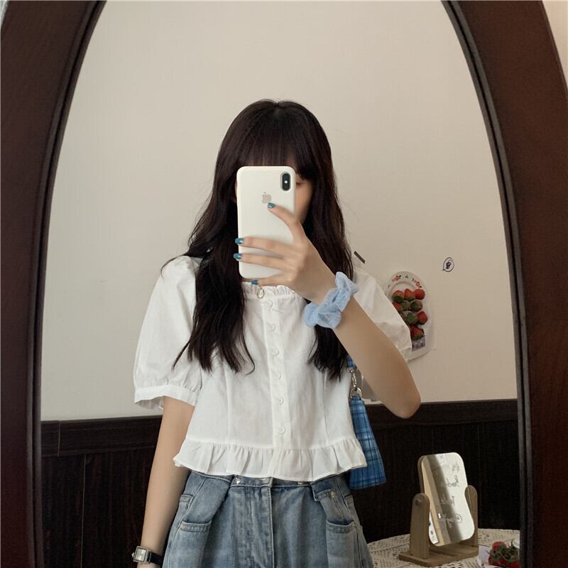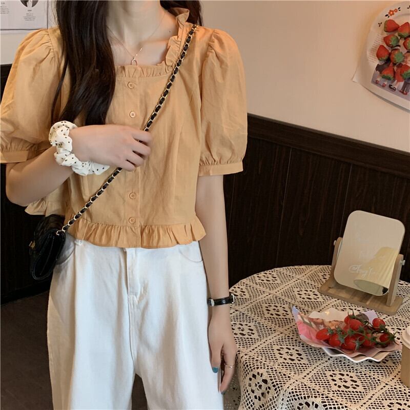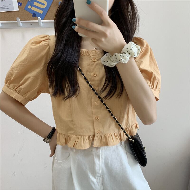 パフスリーブシャツ トップス シャツ ブラウス スイート ガーリー ラブリー ホワイト 白 ピンク イエロー 黄色 ショート丈 袖あり 半袖 パフスリーブ ストレート シングルブレスト ボタン フリル 大人女子 大人 上品 おしゃれ デイリーウェア レトロ レトロ風 こなれ感 キュート かわいい 女子 個性的 デザイン 主役級 存在感 無地 春 スプリング 夏 サマー 20代 10代 レディース 女性用 学生 学校 通学 着回し 普段使い S M L