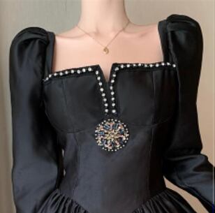 エレガントでクラシカルなスタイルが魅力のブラックミニワンピースドレス。シンプルでありながら、スクエアネックとフレアのAラインシルエットが女性らしさを引き立て、存在感抜群の一枚です。また、大人っぽく着こなすこともできます。20代から40代にかけての幅広い年齢層に対応しています。