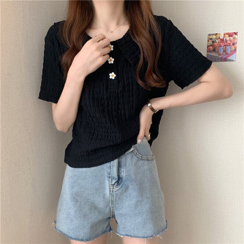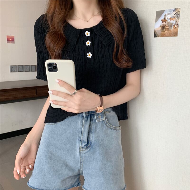 襟付きTシャツ トップス スイート ガーリー ブラック 黒 ホワイト 白 ブルー 青 ミニ丈 ショート丈 袖あり 半袖 襟付き ストレート ボタン 大人女子 大人 上品 おしゃれ デイリーウェア レトロ レトロ風 こなれ感 キュート かわいい 女子 個性的 デザイン 主役級 存在感 無地 夏 サマー 20代 10代 レディース 女性用 女の子 学生 学校 通学 デート お出かけ 女子会 食事会 着回し 普段使い トレンド ファッション コーデ ワンサイズ