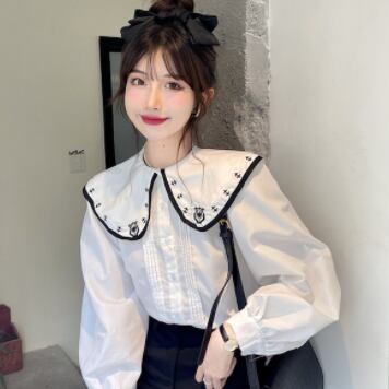 ビッグカラーシャツ トップス シャツ ブラウス スイート ガーリー ホワイト 白 レギュラー丈 袖あり 長袖 ボリューム袖 襟付き シングルブレスト ボタン 大人女子 大人 上品 おしゃれ デイリーウェア レトロ レトロ風 こなれ感 ルーズ シルエット ラフ キュート かわいい 女子 個性的 デザイン 主役級 存在感 無地 春 スプリング 20代 10代 レディース 女性用 学生 学校 通学 デート お出かけ 女子会 食事会 着回し 普段使い ワンサイズ